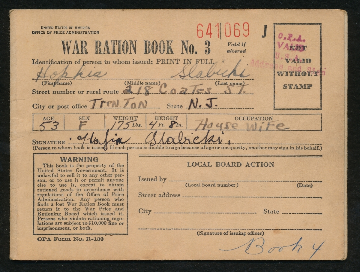 Vintage World War II War Ration Book No. 3 from 1943. Serial Number 641069. The front of the booklet has been stamped and hand-signed by the original owner. Several pages of ration stamps remain inside the booklet, please see photo for details.
