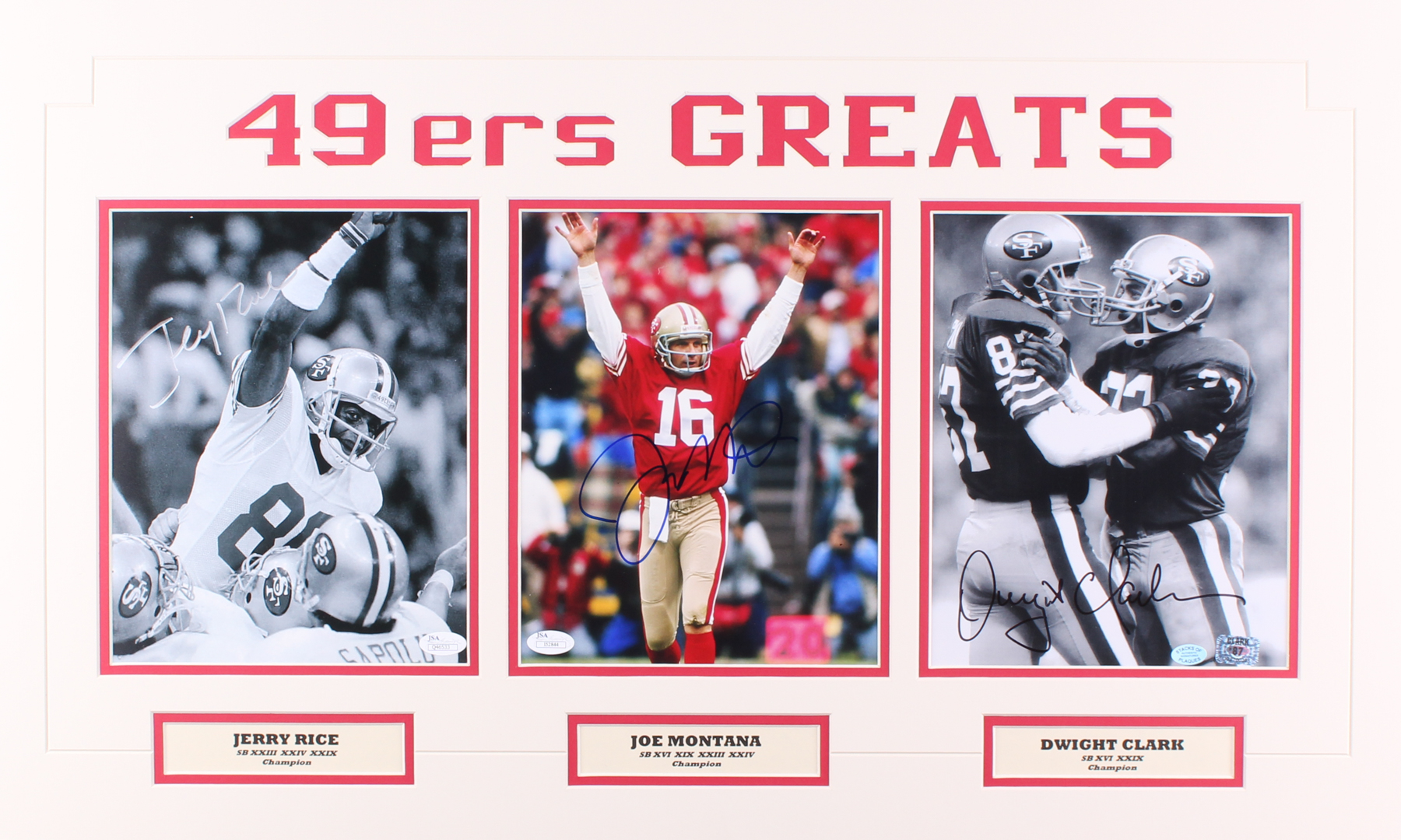Jerry Rice, Joe Montana & Dwight Clark Signed "49ers Greats" 18x30 Custom Matted 8x10 Photo Display Inscribed (SOP, JSA COA & Clark Hologram)