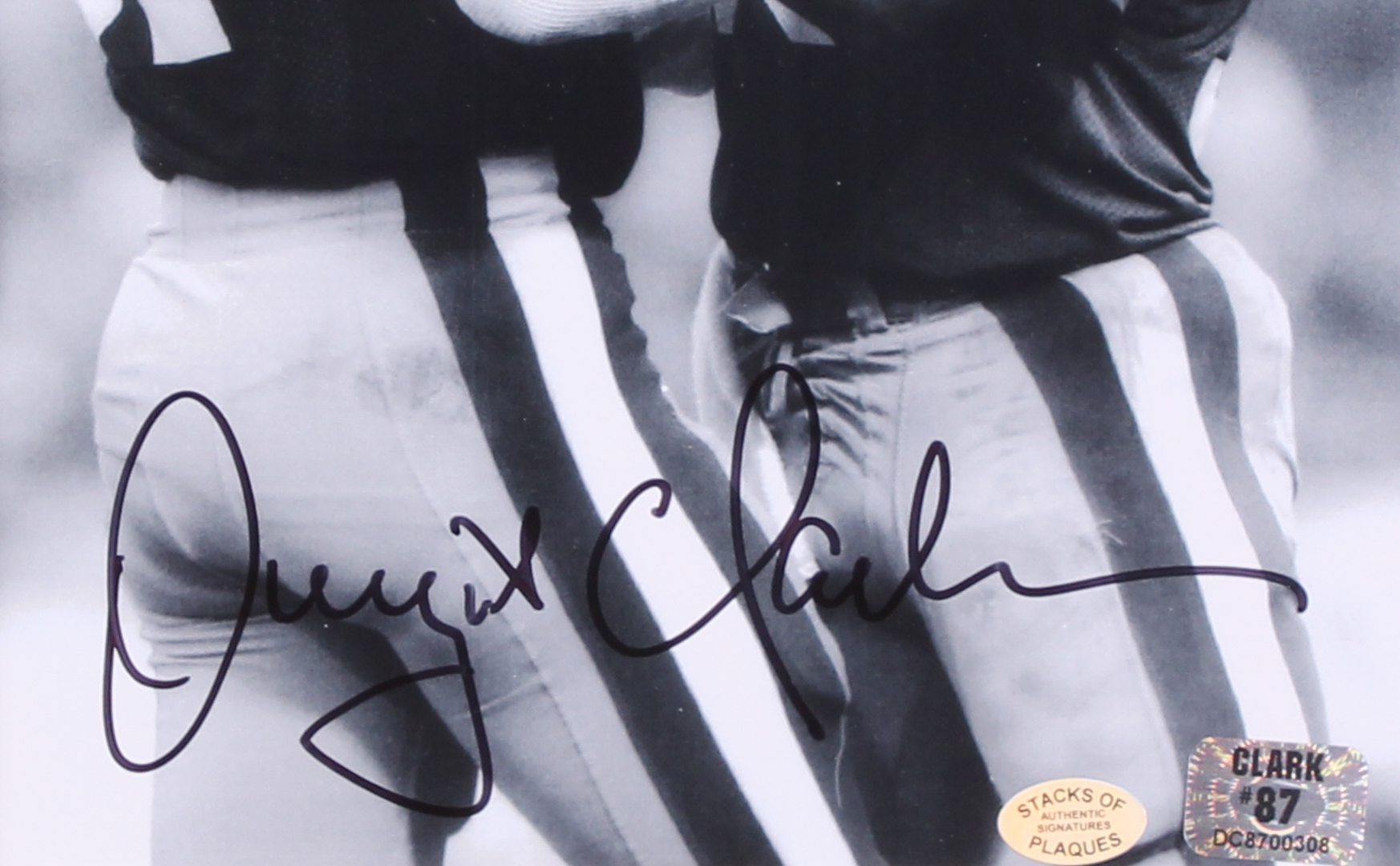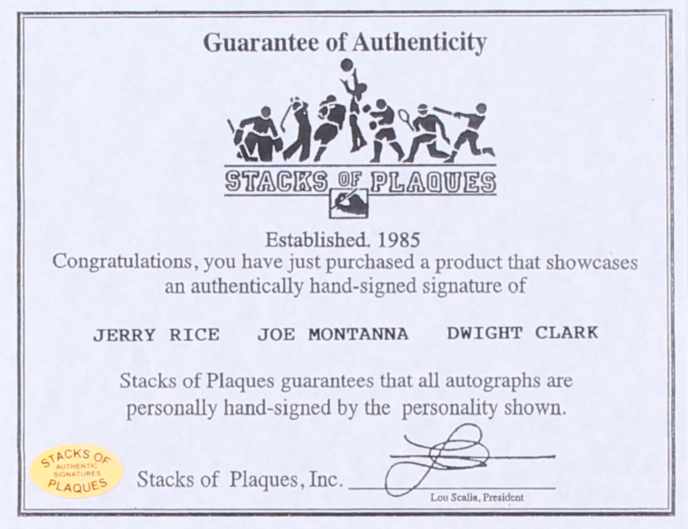 The autograph includes an official Stacks of Plaques - Est. 1985, celebrating 30 years in the business - hologram and matching COA, an official James Spence Authentication (JSA) Hologram and matching COA as well as an official Dwight Clark player hologram for authenticity purposes.