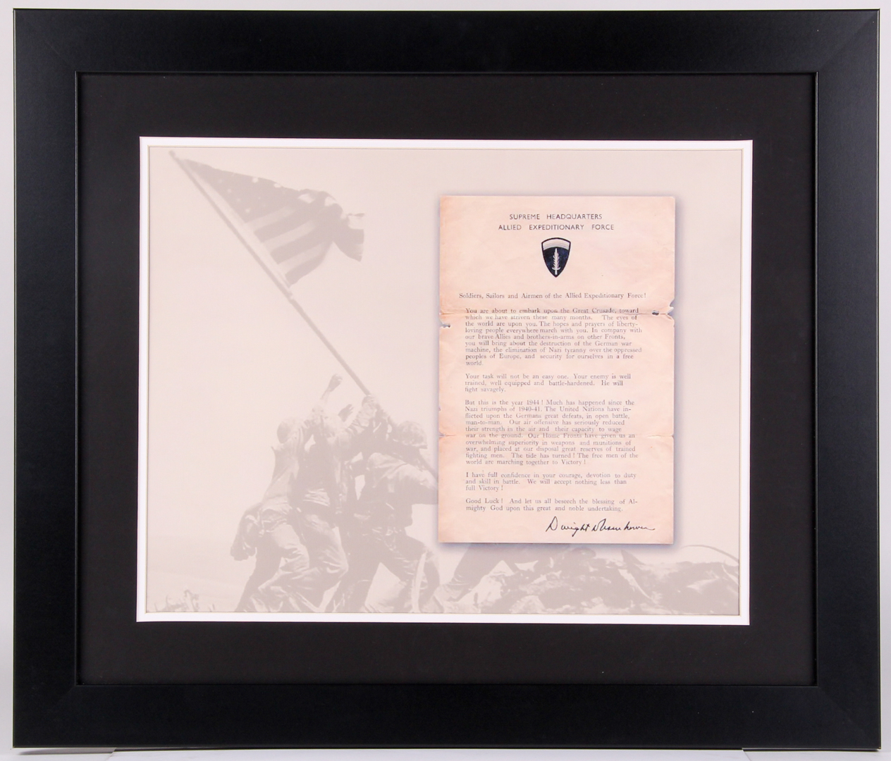 Custom framed photo display measure 23.5" x 27.5" in size and features a photo of the message Dwight D. Eisenhower sent to allied forces on the day of the Normandy Invasion on June 6, 1944. Please note, signature is a facsimile.