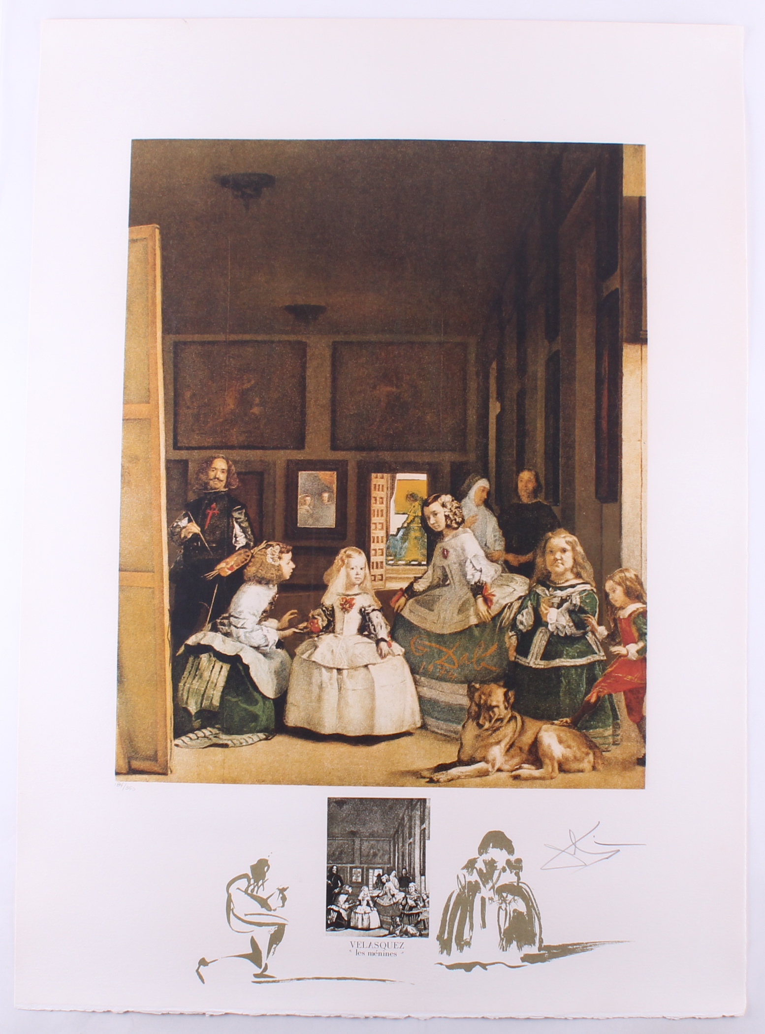 "Velazquez" from the suite "Changes in Great Masterpieces" measures approximately 25" x 35" in size. Hand-signed in pencil by Salvador Dali (D. 1989). The piece is a limited edition and has been hand-numbered #184/350.