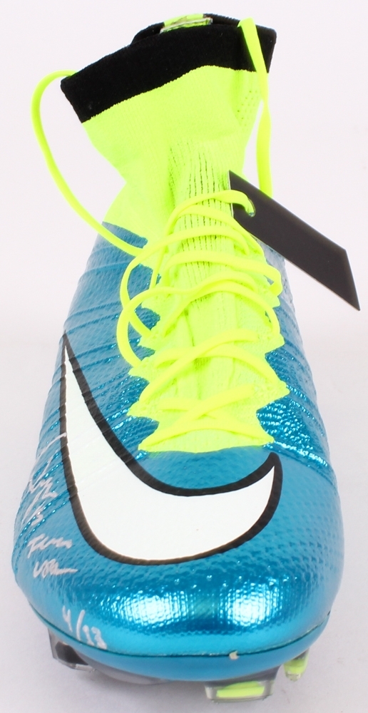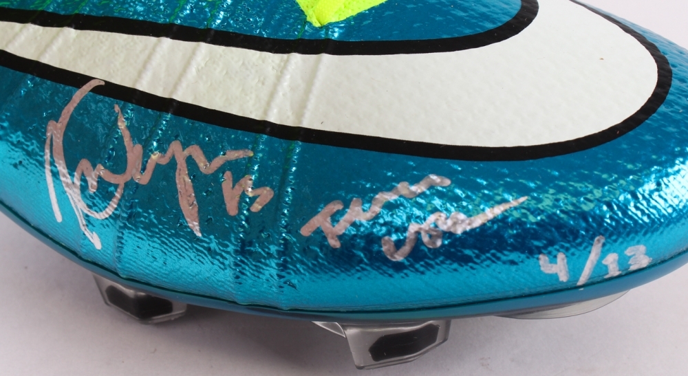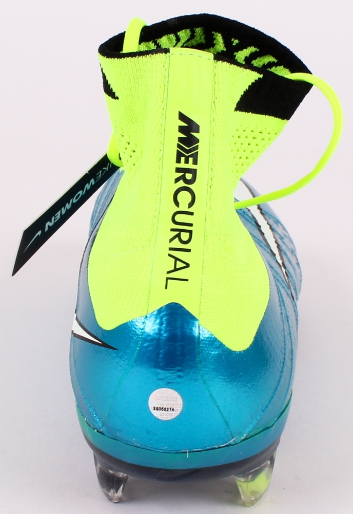 Nike Mercurial shoe, size 10 has been hand signed and inscribed in silver paint pen by Alex Morgan. The shoe is a limited edition and has been hand-numbered #/13.