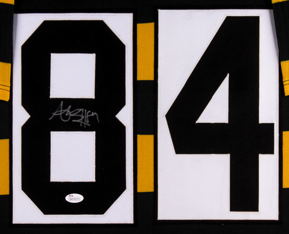Custom frame measures approximately 35" x 43" in size and features a jersey which has been hand-signed in silver paint pen by Antonio Brown.