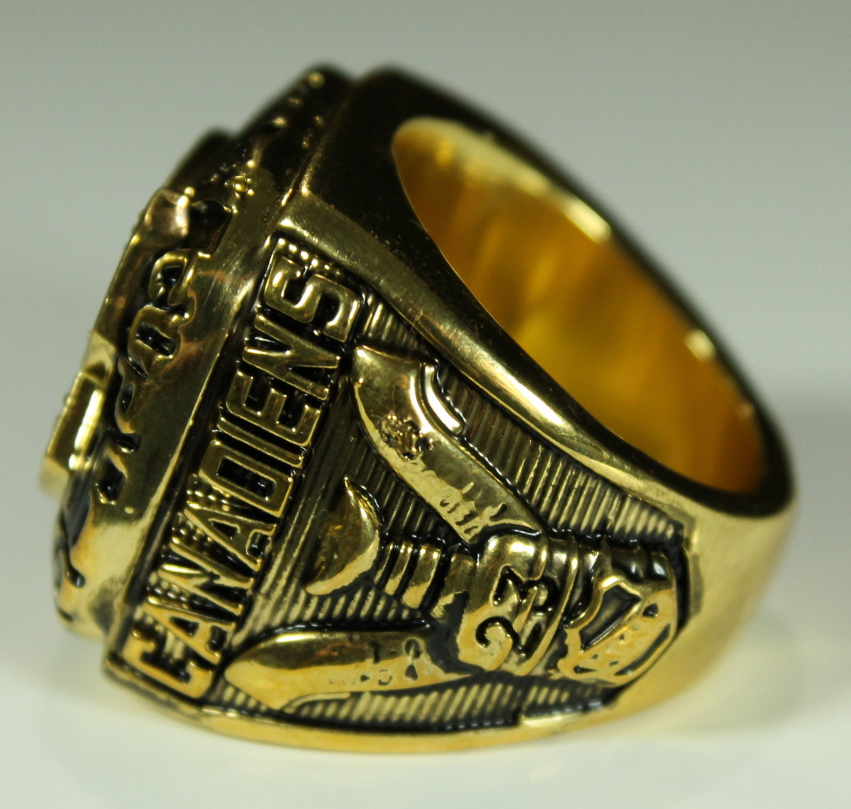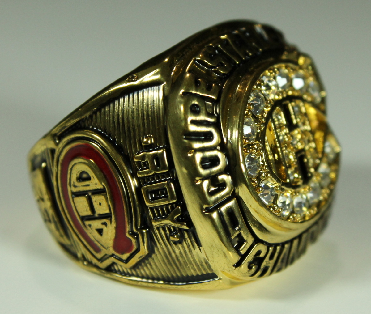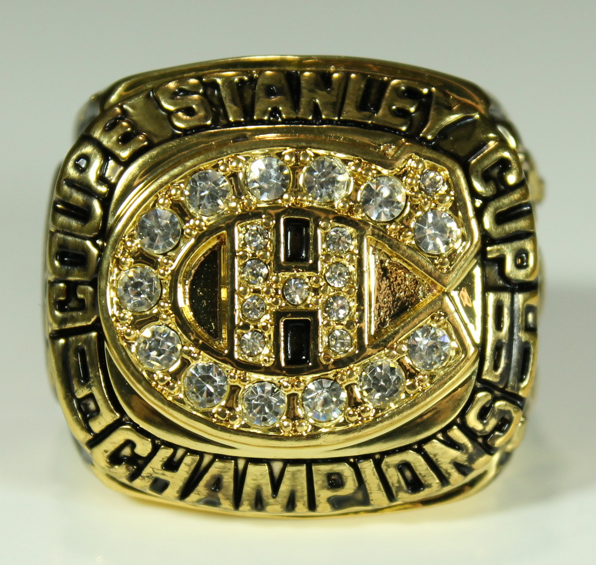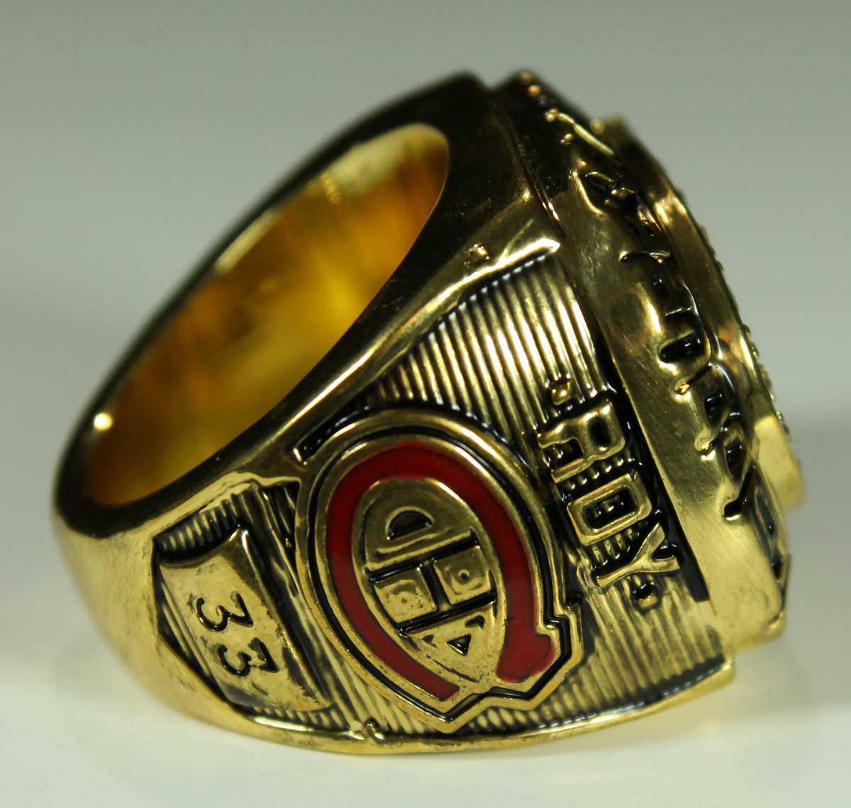 Patrick Roy Montreal Canadiens 1986 Stanley Cup Championship Ring (High Quality Replica). The ring has been hand crafted by professional jewelers. Made of solid metal with 18K yellow gold. Size 11, weight 80g.