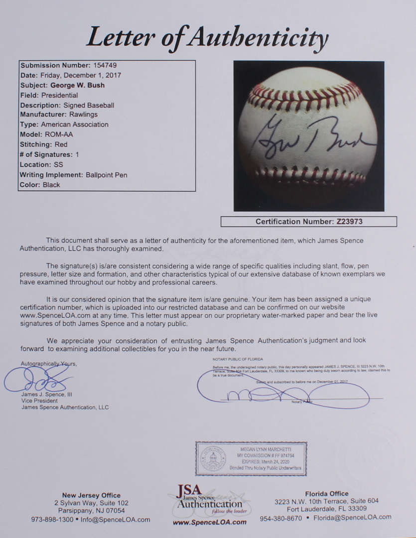 Rawlings American Association baseball. Hand-signed in black ink pen by George W. Bush.