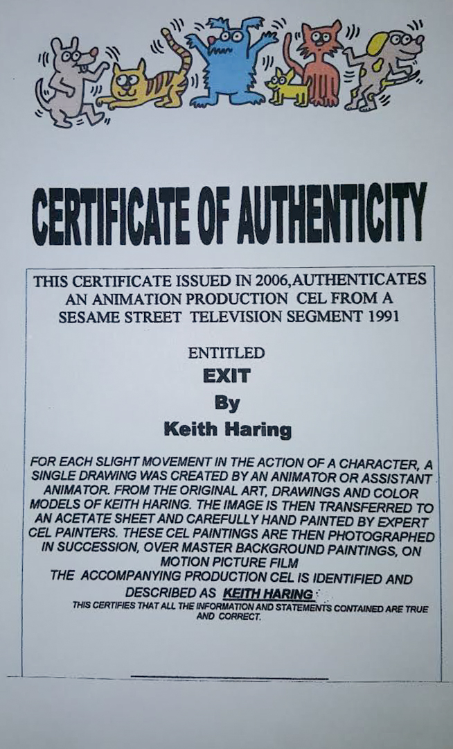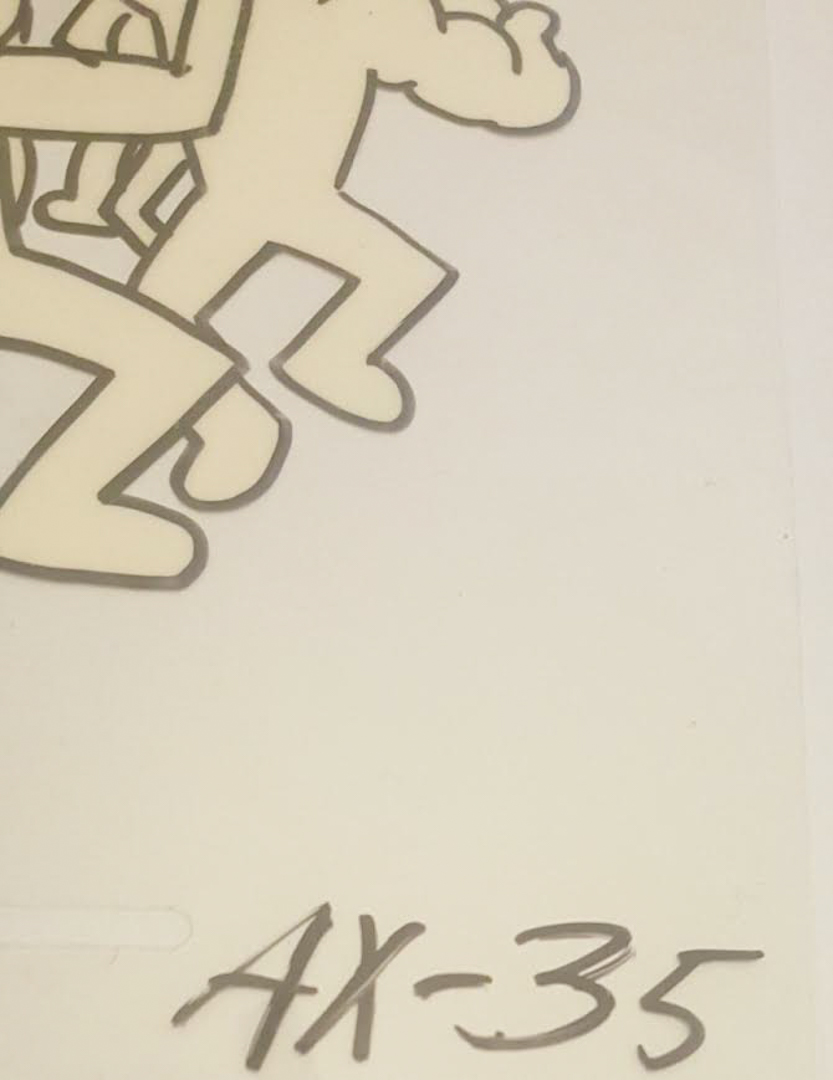 Cel was part of a cartoon SEGMENT entitled "EXIT" created for Children's Television Workshop completed 1991 and aired on "Sesame Street" The Basketball player. The concept, drawing, characters as well as Scripts and test animation were created by Keith Haring beginning in 1989 and 1990 under the direction of Arlene Sherman Producer for Children’s Television Workshop. Before his death, Haring conferred with Animator Bill Davis to bring his characters to life on the screen in 1990. Test animation was completed and final contracts were signed in 1991.