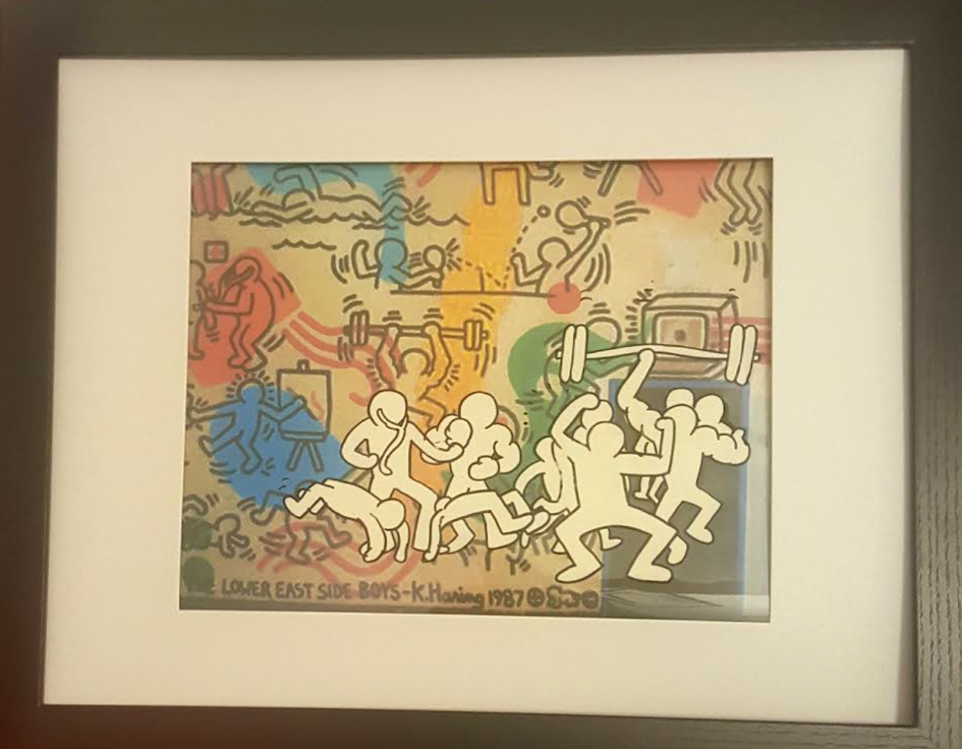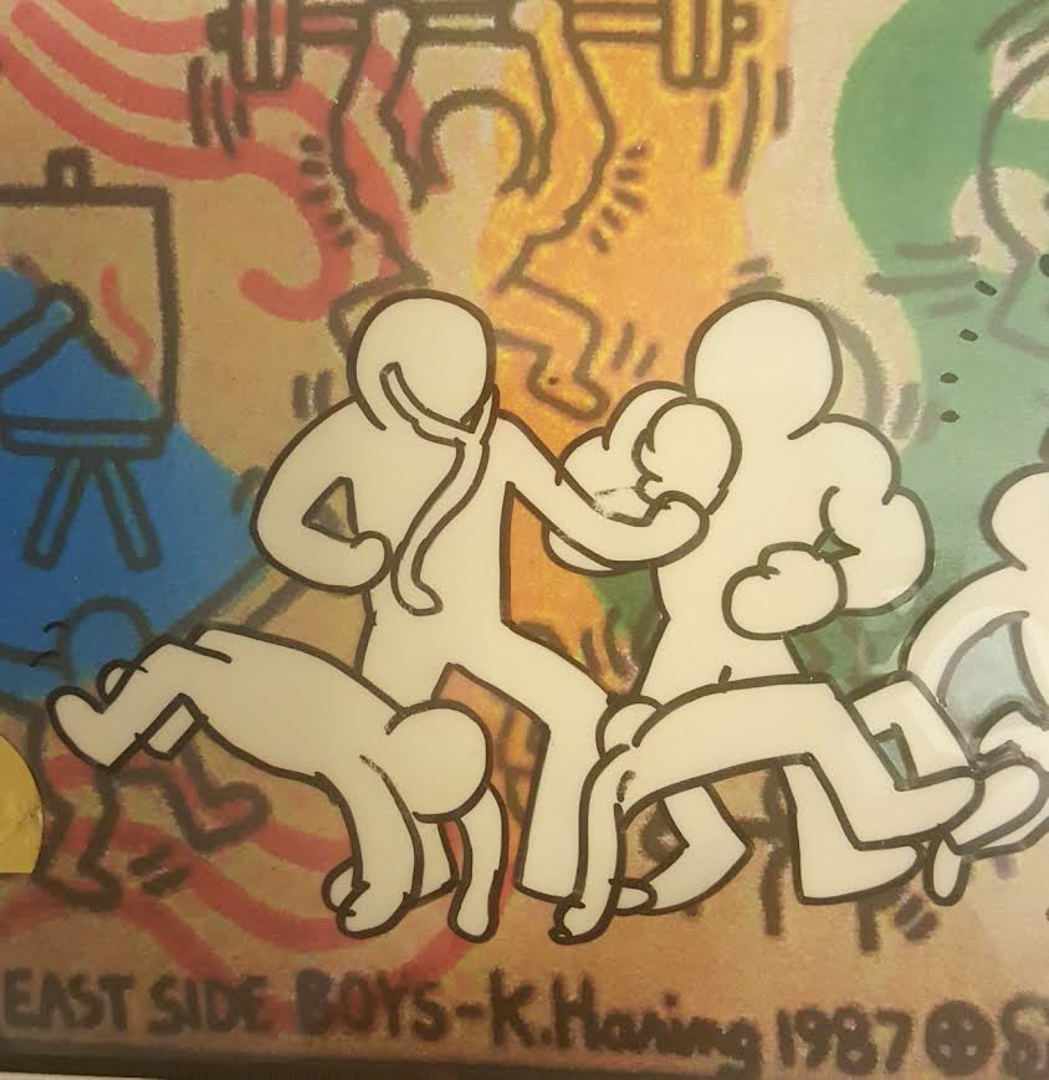 Rare Authentic hand inked and hand-painted animation production cel from the art of Keith Haring (D 1990) actually used in the production of an animated spot in the show "Sesame Street" . Clear cel on a copy of the original 1987 Boys and Girls Club Mural and Keith Haring painting the wall background with production numbers on the lower right corner of the cel.. Measures approximately 12.5" x 10.5" in size. Custom framed 12" x 15" with the archival mat. Also includes photocopy of the script and storyboard. This is a one-of-a-kind piece. Contains an authentication numbered holographic seal on the lower left with FFE authentication COA on the back of the framed art.