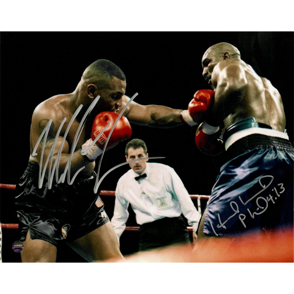 Photo measures 8" x 10" in size. Hand-signed in silver paint pen by Mike Tyson and Evander Holyfield.