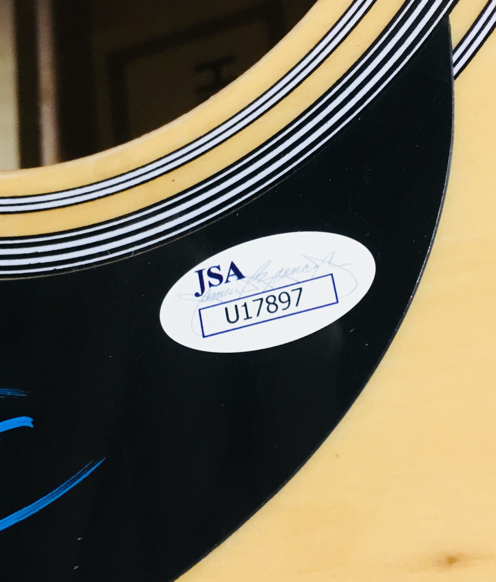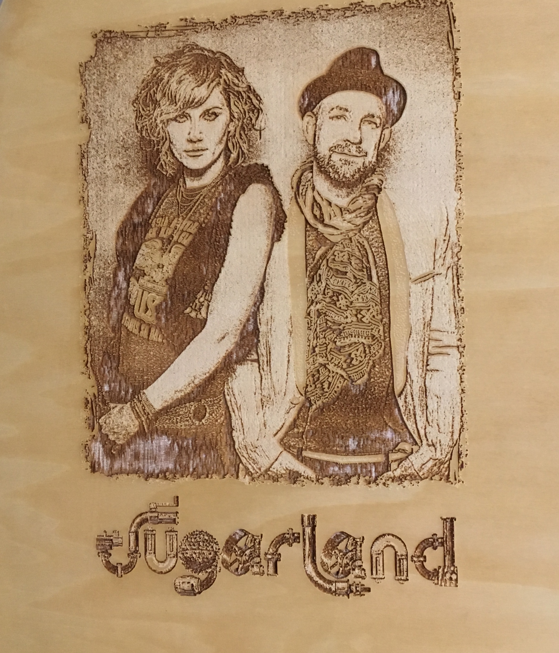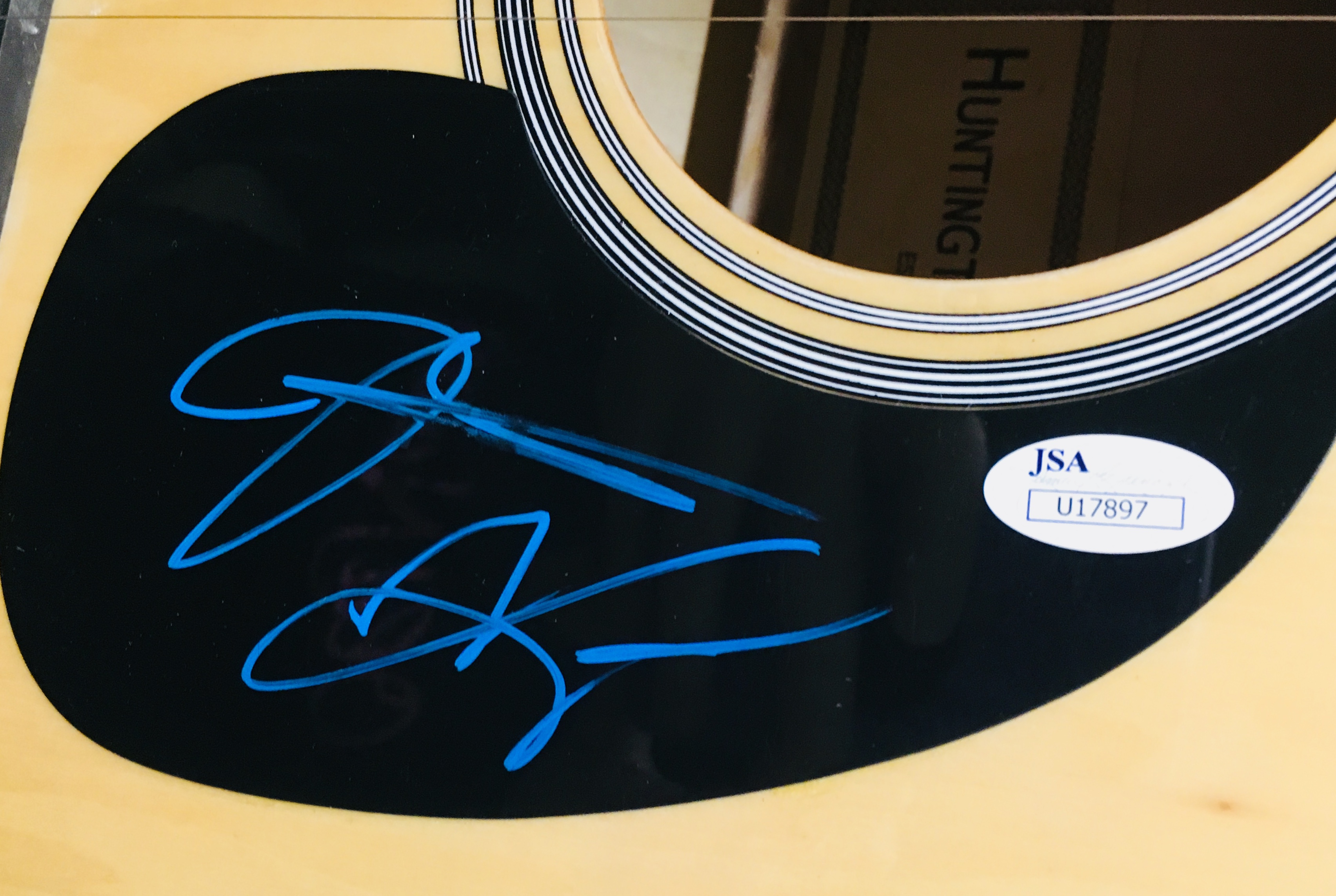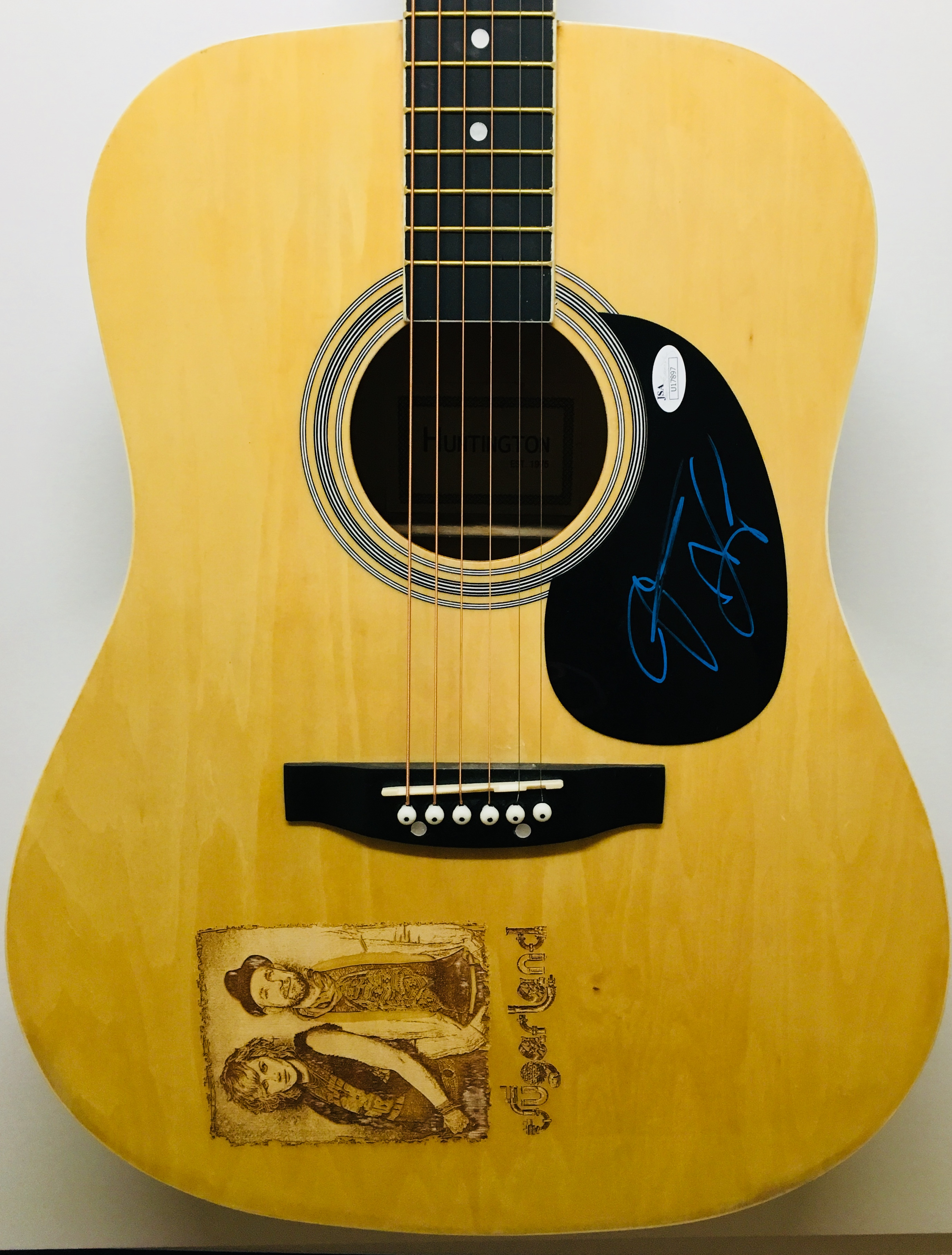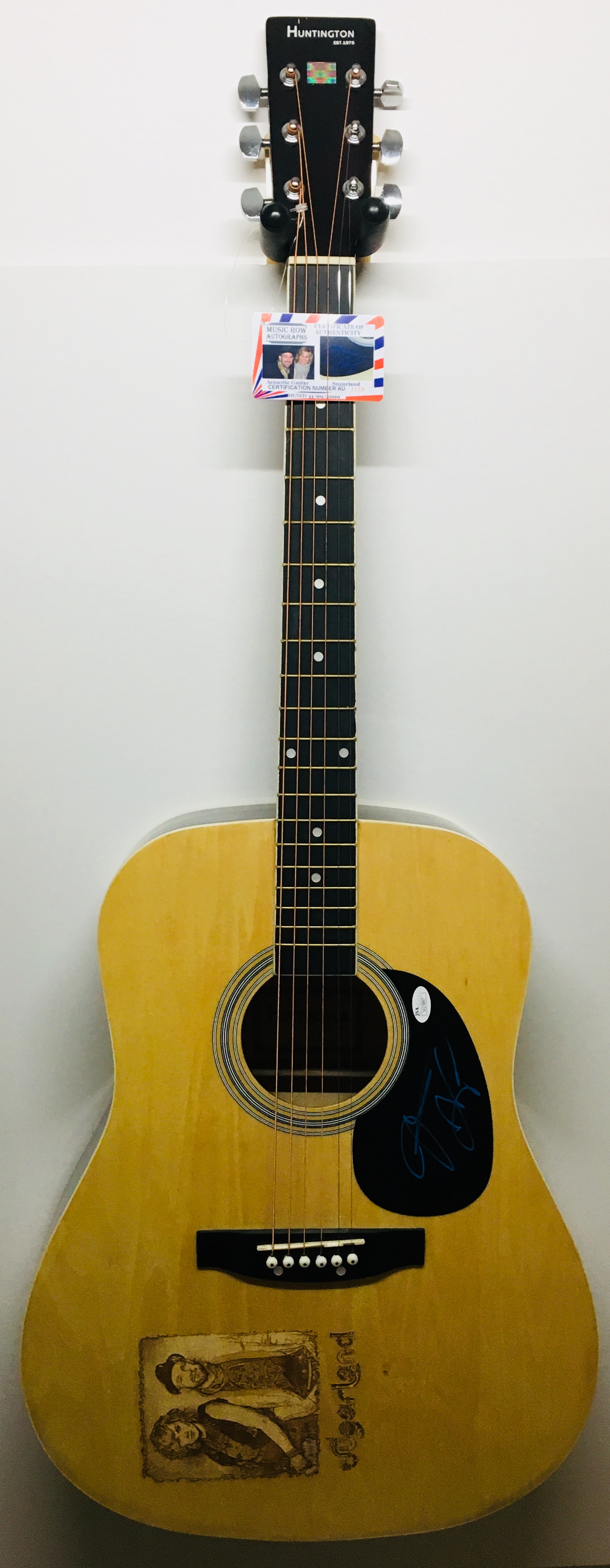 Full-size Huntington laser engraved acoustic guitar, hand signed on the pick guard by Sugarland members, Jennifer Nettles and Kristian Bush, in blue fiber-tip pen.