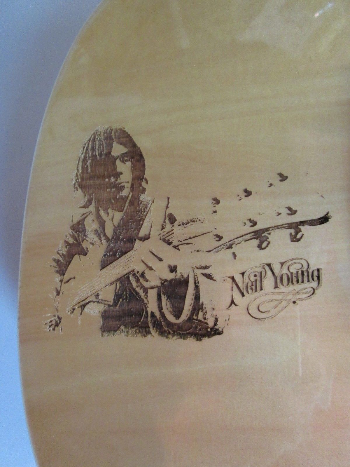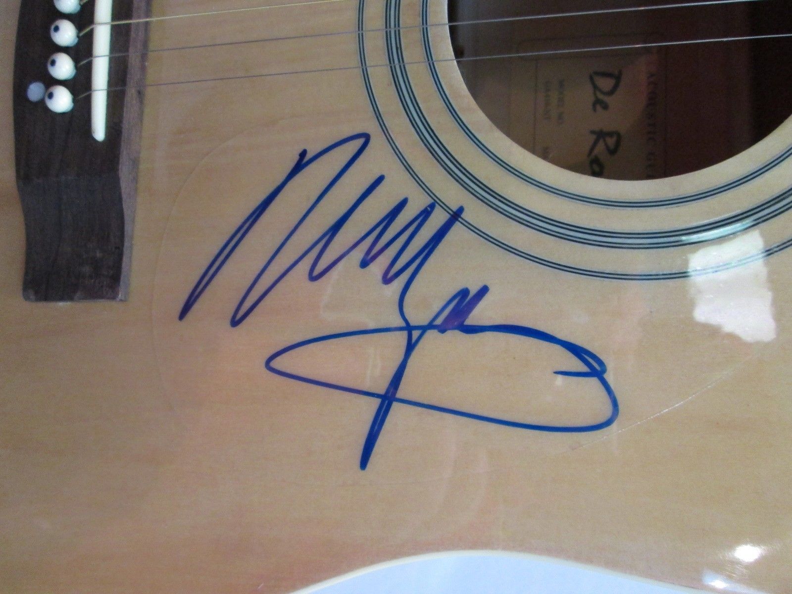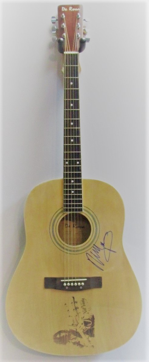 Full-size DeRosa acoustic guitar, hand-signed on the pickguard by Neil Young, in blue fiber tip marker. The guitar has an image of Young on the body as shown.