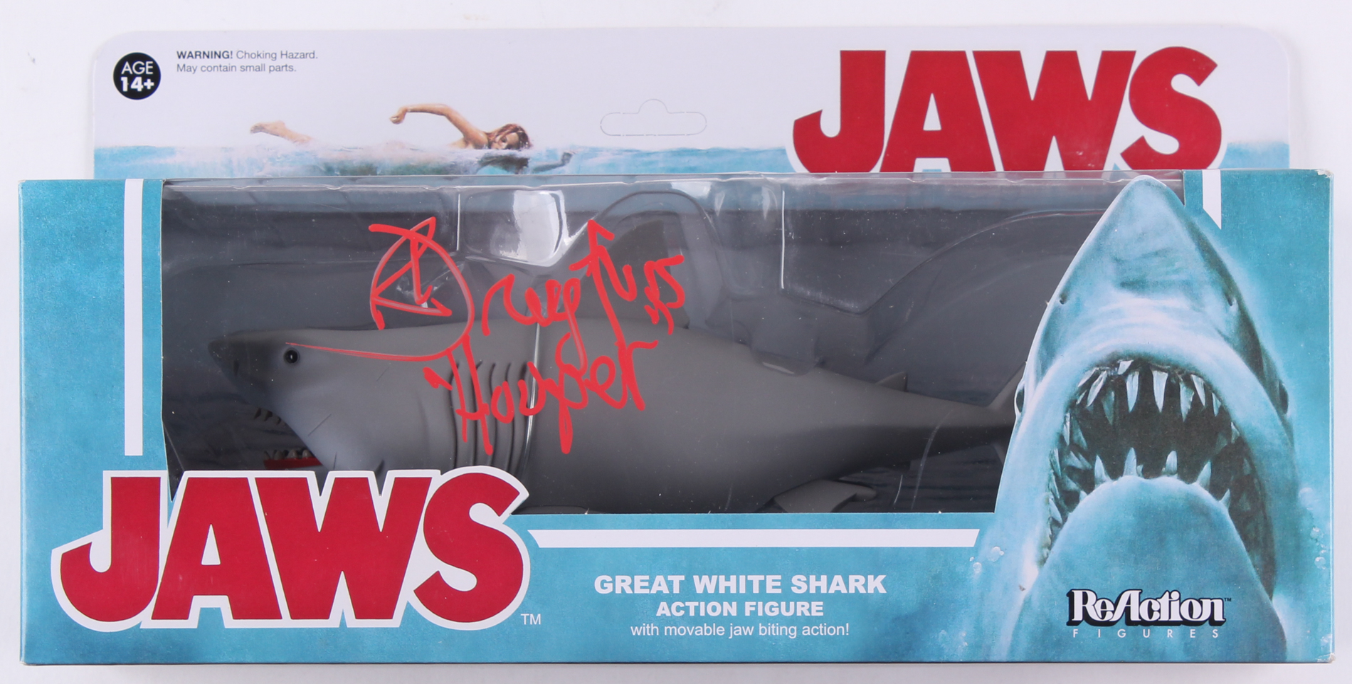 Universal Pictures Jaws action figure measures approximately 10". Hand-signed in orange paint pen on the packaging by Richard Dreyfuss (Matt Hooper).