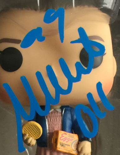 Stranger Things Funko figure measures approximately 4" tall. Hand-signed in blue paint pen on the box by Millie Bobby Brown (Eleven).