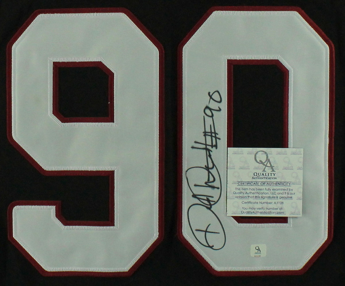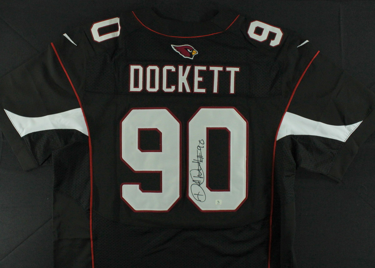 Reebok on-field style jersey. Everything sewn on, size 52. Hand-signed in black felt-tip pen by Darnell Dockett. The autograph includes an official Quality Authentication (QA) hologram and matching COA for authenticity purposes.