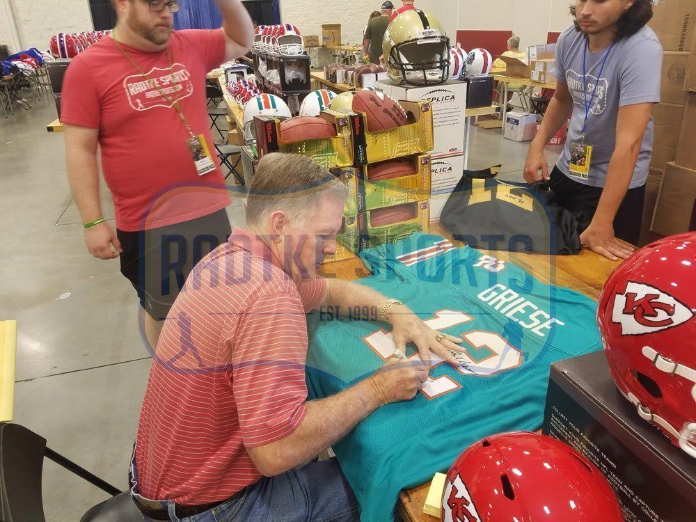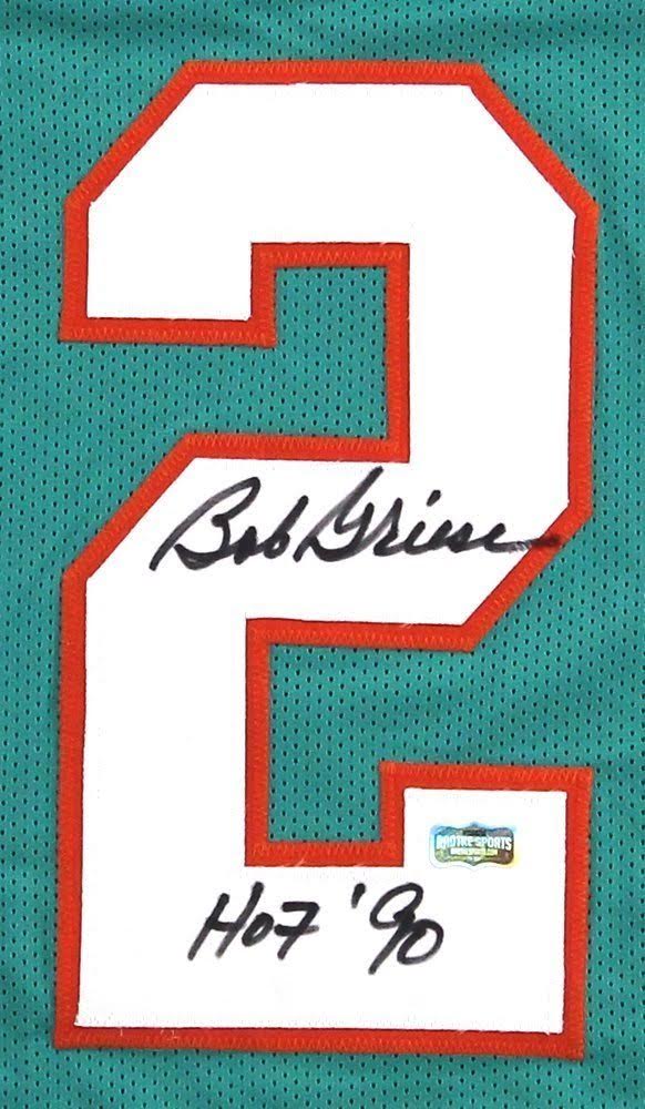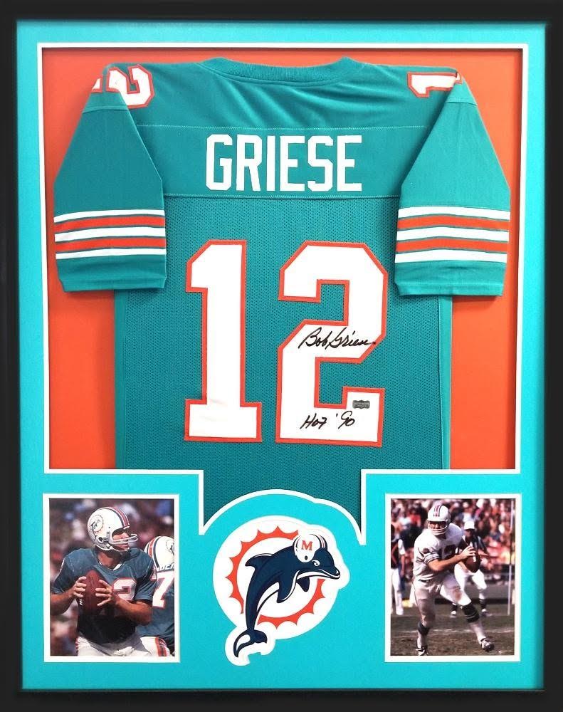 Custom frame measures approximately 34" x 42" in size and features a jersey which has been hand-signed and inscribed in black felt-tip pen by Bob Griese (HOF).
