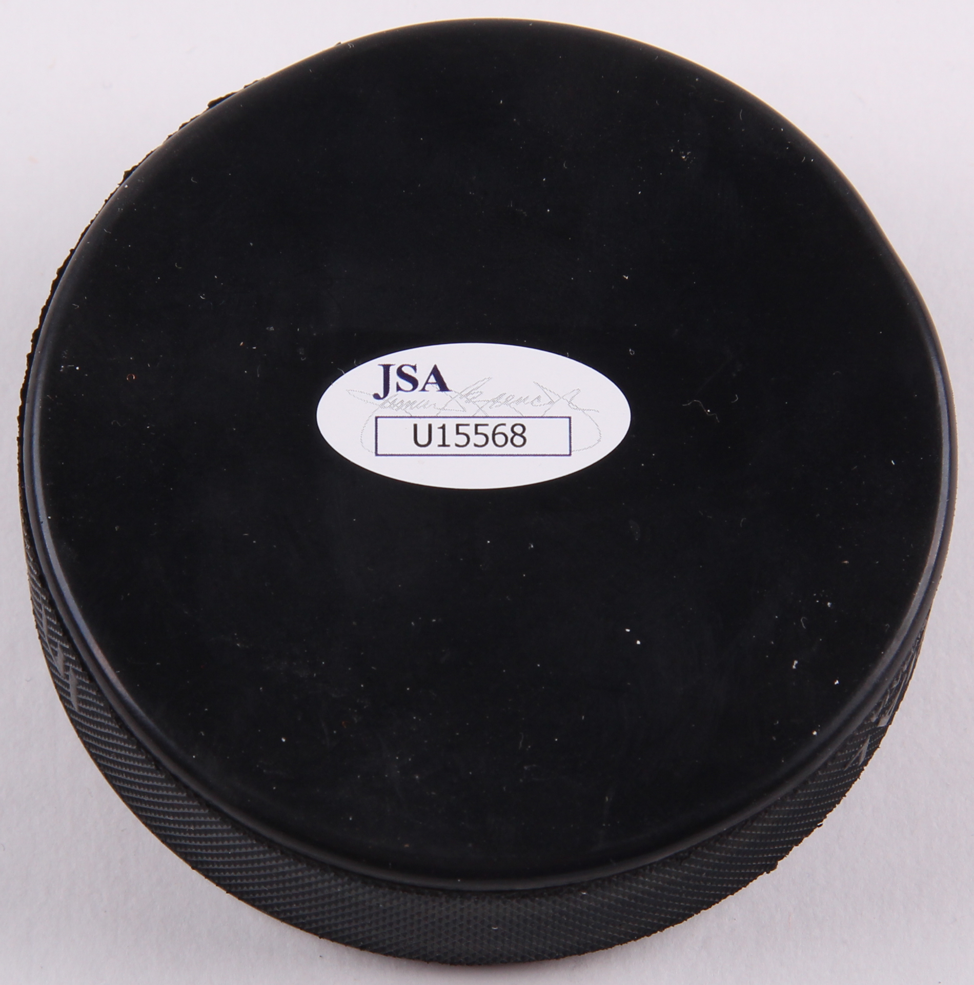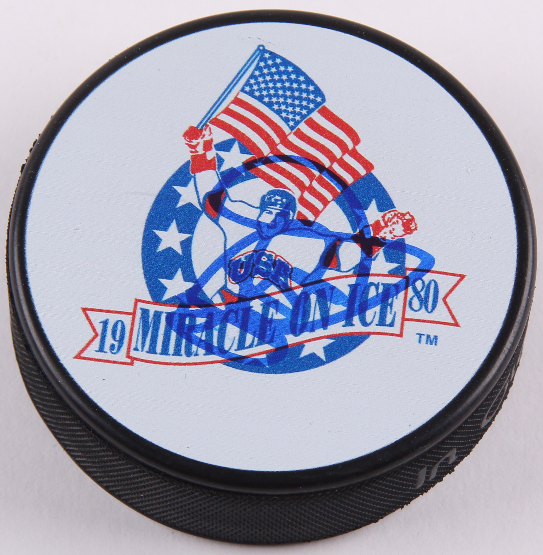 1980 Miracle on ice logo hockey puck. Hand-signed in blue felt-tip pen by Al Michaels (Sportscaster).