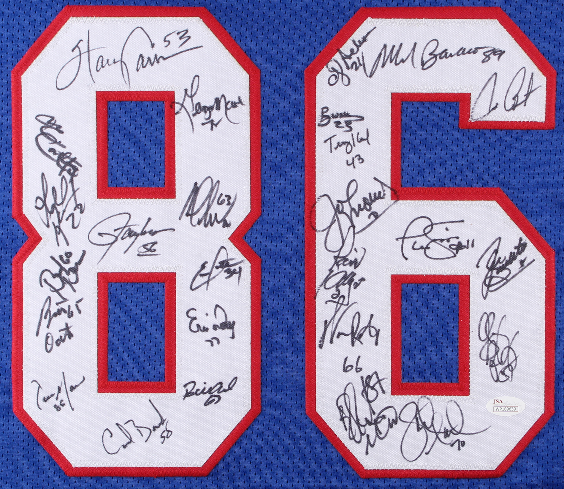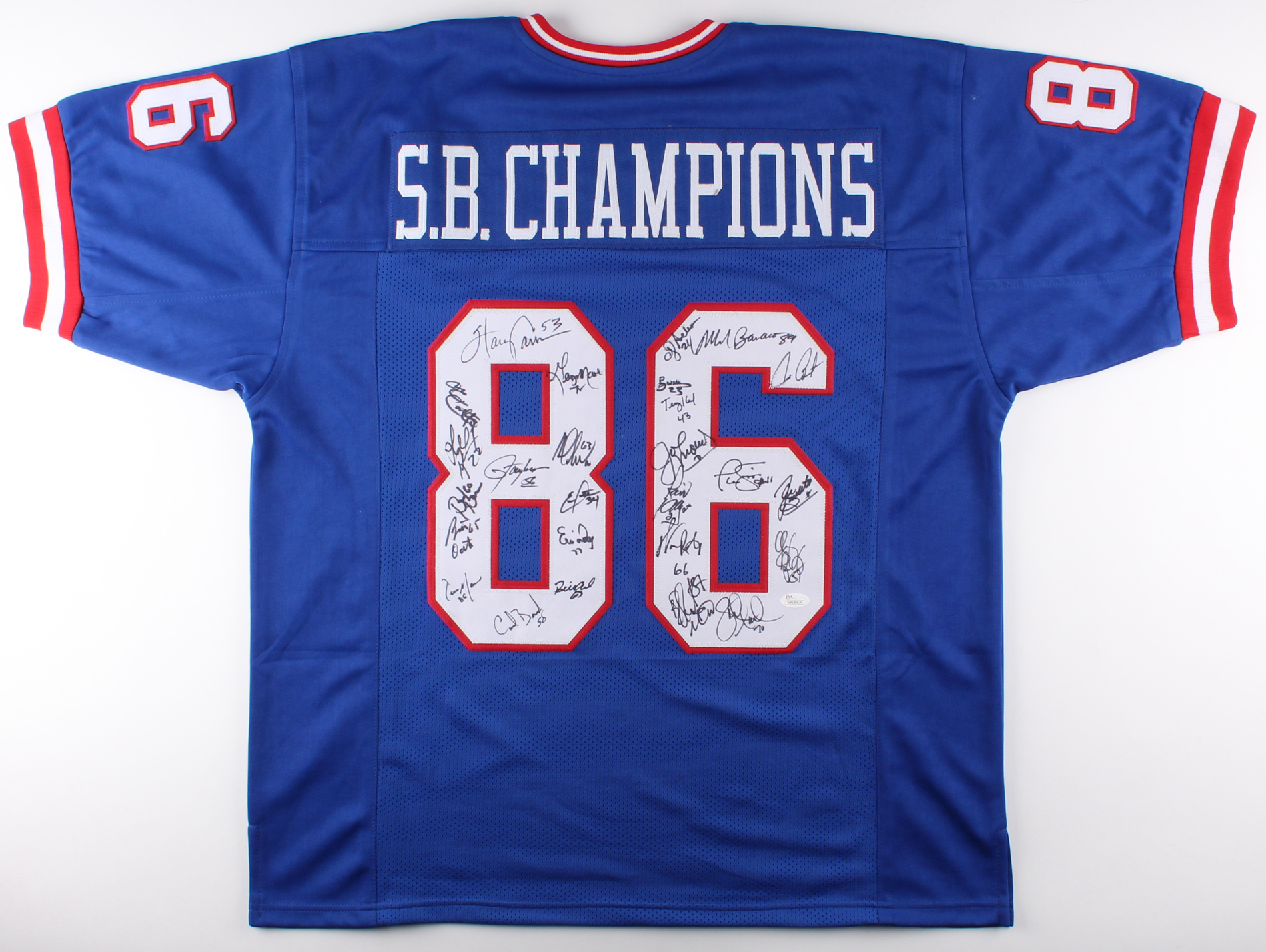 1986 New York Giants Jersey Team-Signed by (26) with Phil Simms, Lawrence Taylor, Mark Bavaro, Ottis Anderson, Byron Hunt, Harry Carson (JSA COA)