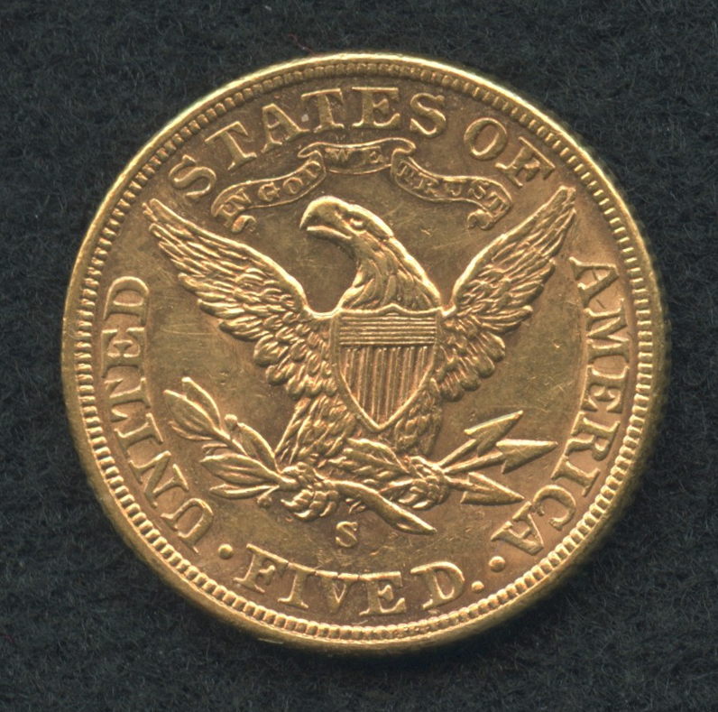 The Half Eagle is a United States coin that was produced for circulation from 1795 to 1929 and in commemorative and bullion coins since the 1980s. Composed almost entirely of gold, it has a face value of five dollars. Its production was authorized by The Act of April 2, 1792, and it was the first gold coin minted by the United States.