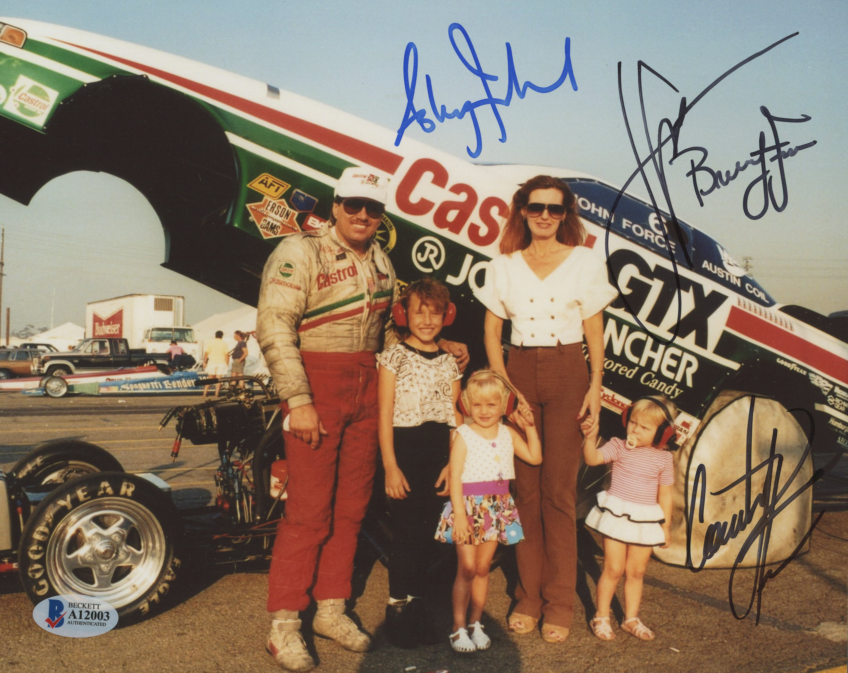 Photo measures 8" x 10" in size and has been hand signed in black and blue felt tip pen by John Force, Courtney Force, Ashley Force, and Brittany Force.