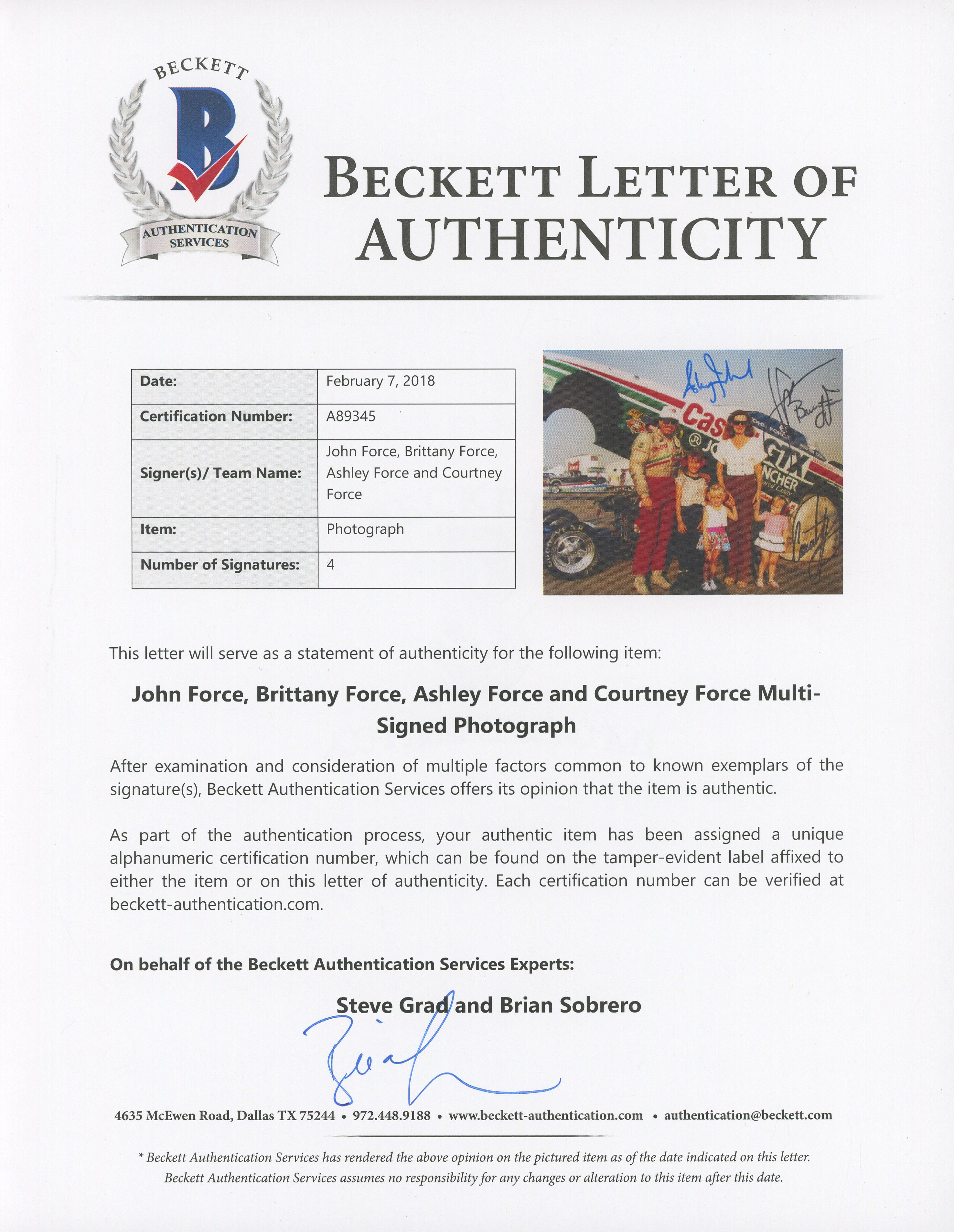 Nascar 8x10 Photo Signed by (4) With John Force, Courtney Force, Ashley Force & Brittany Force (Beckett LOA)