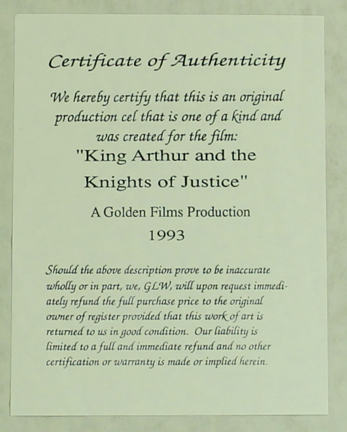 This lot includes an original hand-painted Animation Production Cel used in the production of "King Arthur & The Knights of Justice" (A Golden Films Production 1993). This is a one-of-a-kind piece mounted on a custom matted display. Custom matted to an overall size of 14" x 16". Includes a COA from Golden Films for authenticity purposes.