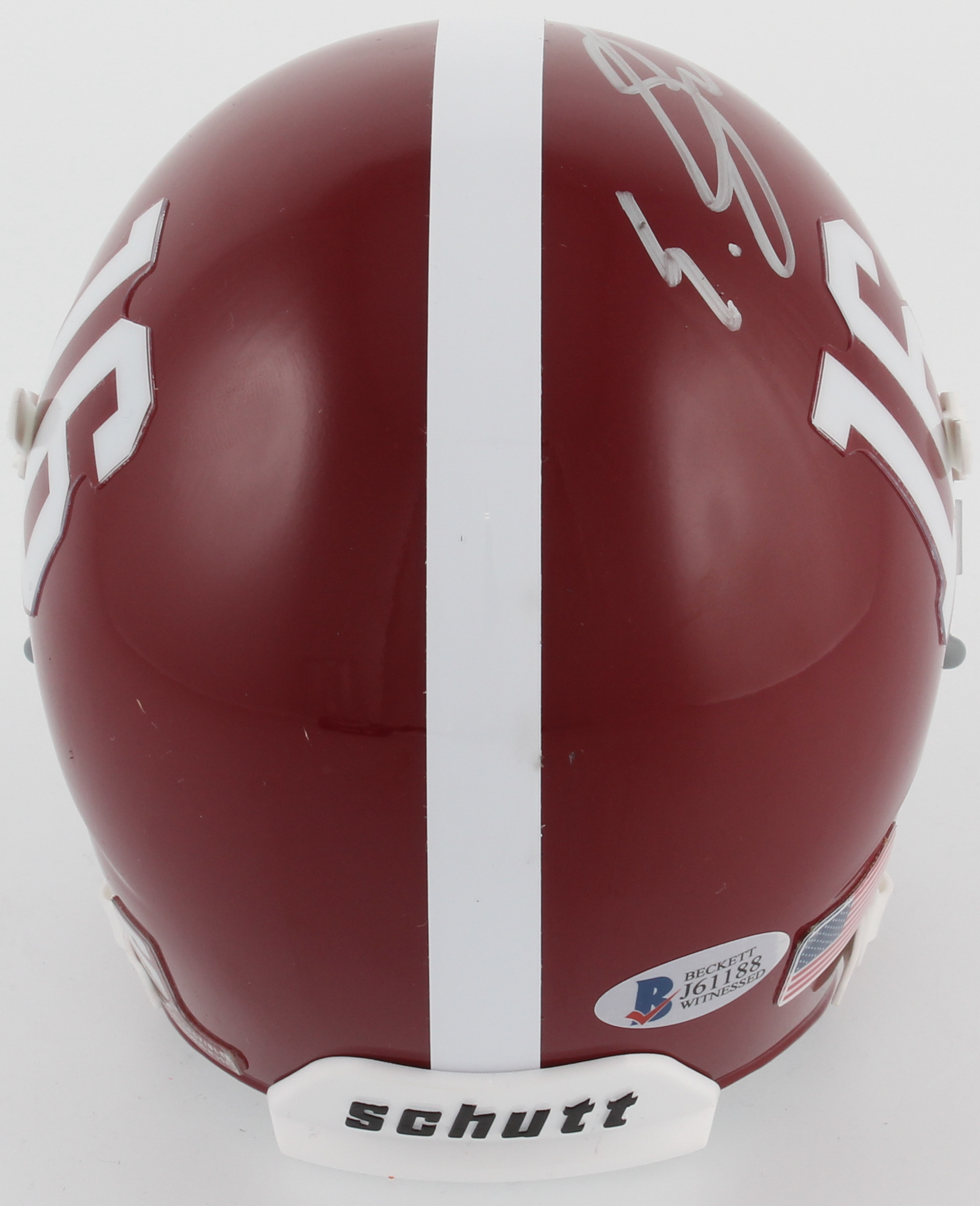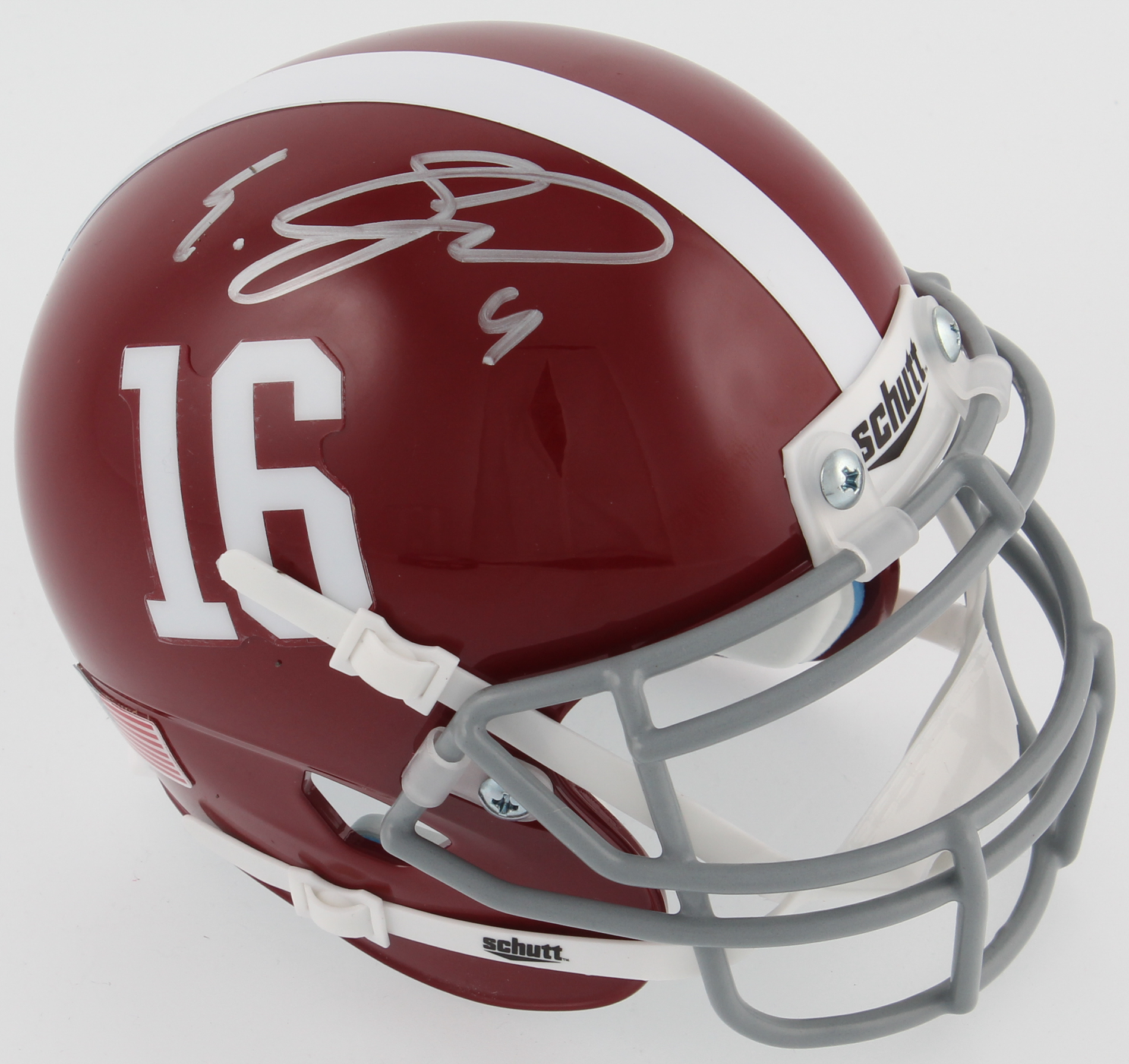 Schutt Alabama Crimson Tide mini helmet. Hand-signed in silver paint pen by Eddie Jackson.