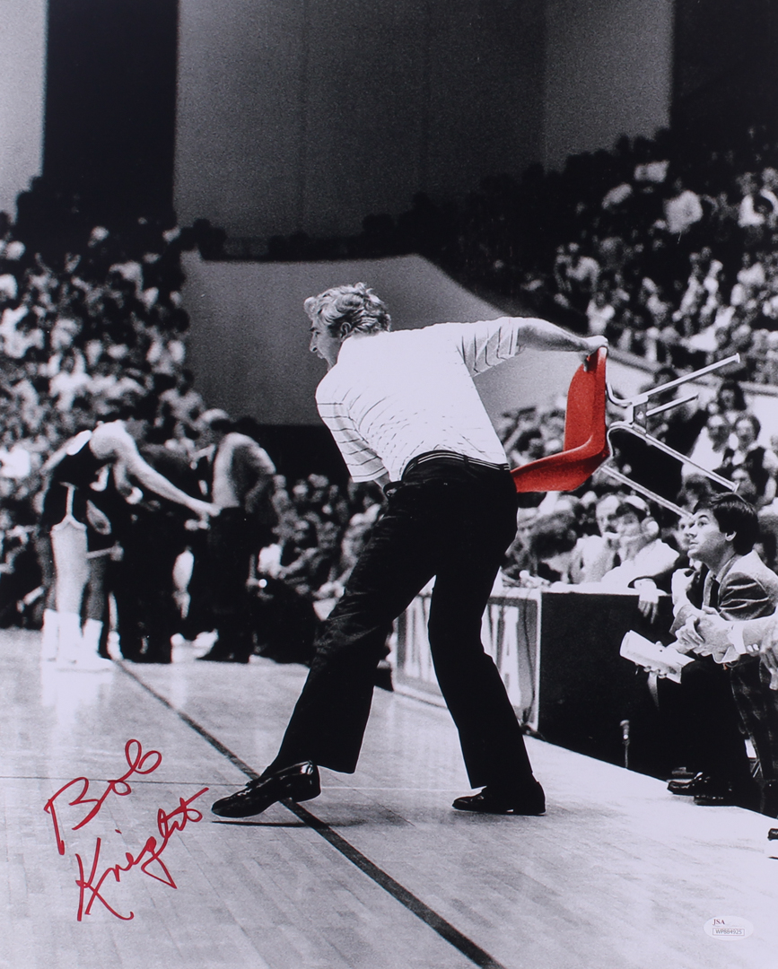 Photo measures 16" x 20" in size and has been hand-signed in red paint pen by Bob Knight (HOF).