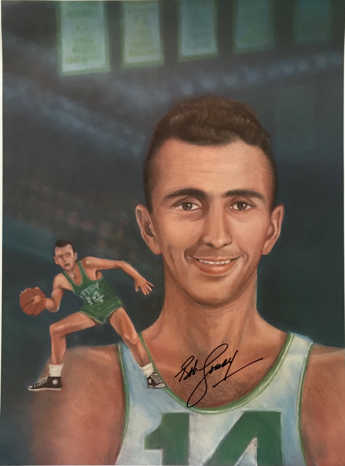 Photo measures 18" x 24" and has been hand-signed in black felt-tip pen by Bob Cousy (HOF).