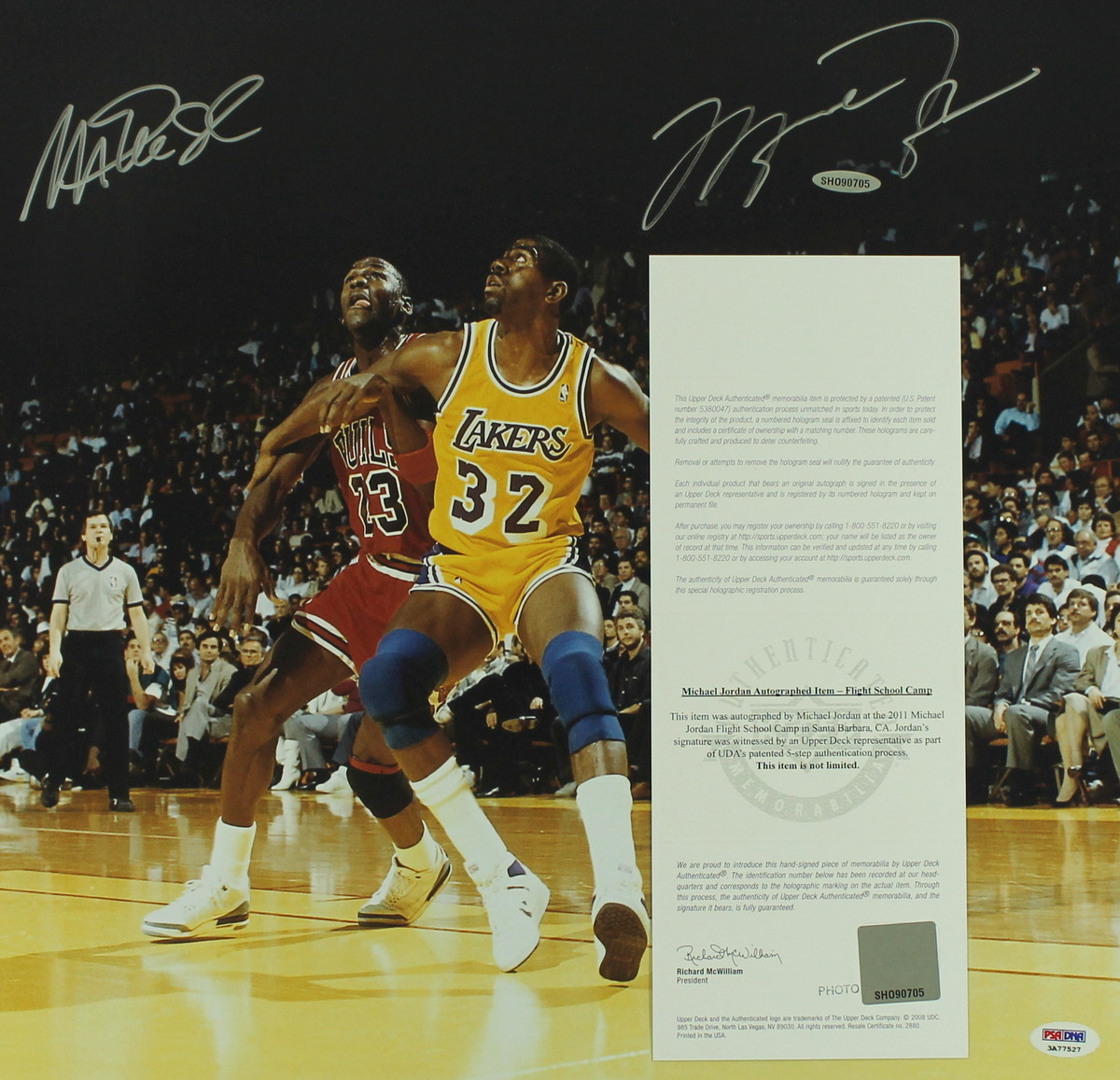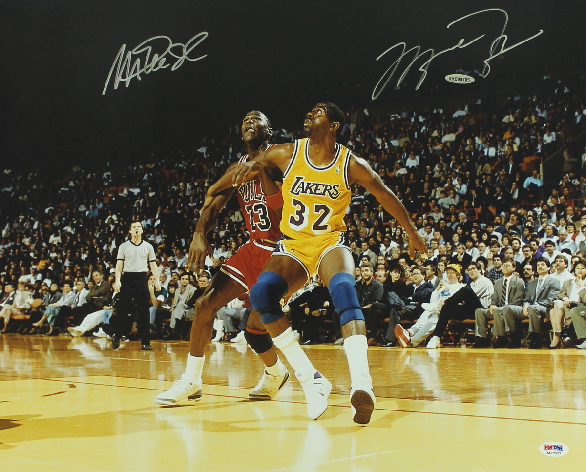 Photo measures 16x20 in size and has been hand-signed in silver paint pen by Michael Jordan (Bulls HOF) and Magic Johnson (Lakers HOF). The autographs include an official PSA/DNA hologram & Upper Deck Authenticated hologram and matching COA for authenticity purposes.