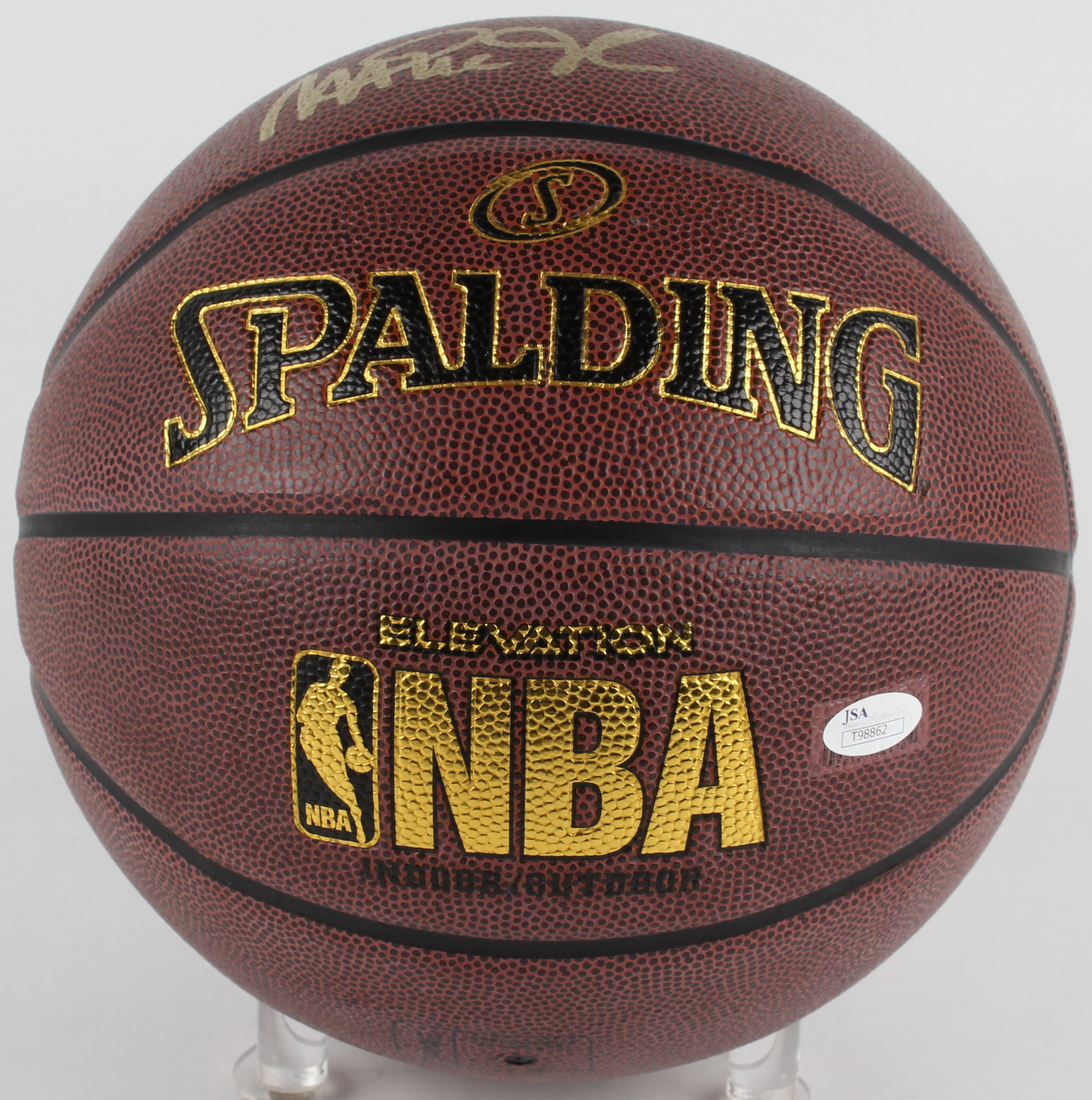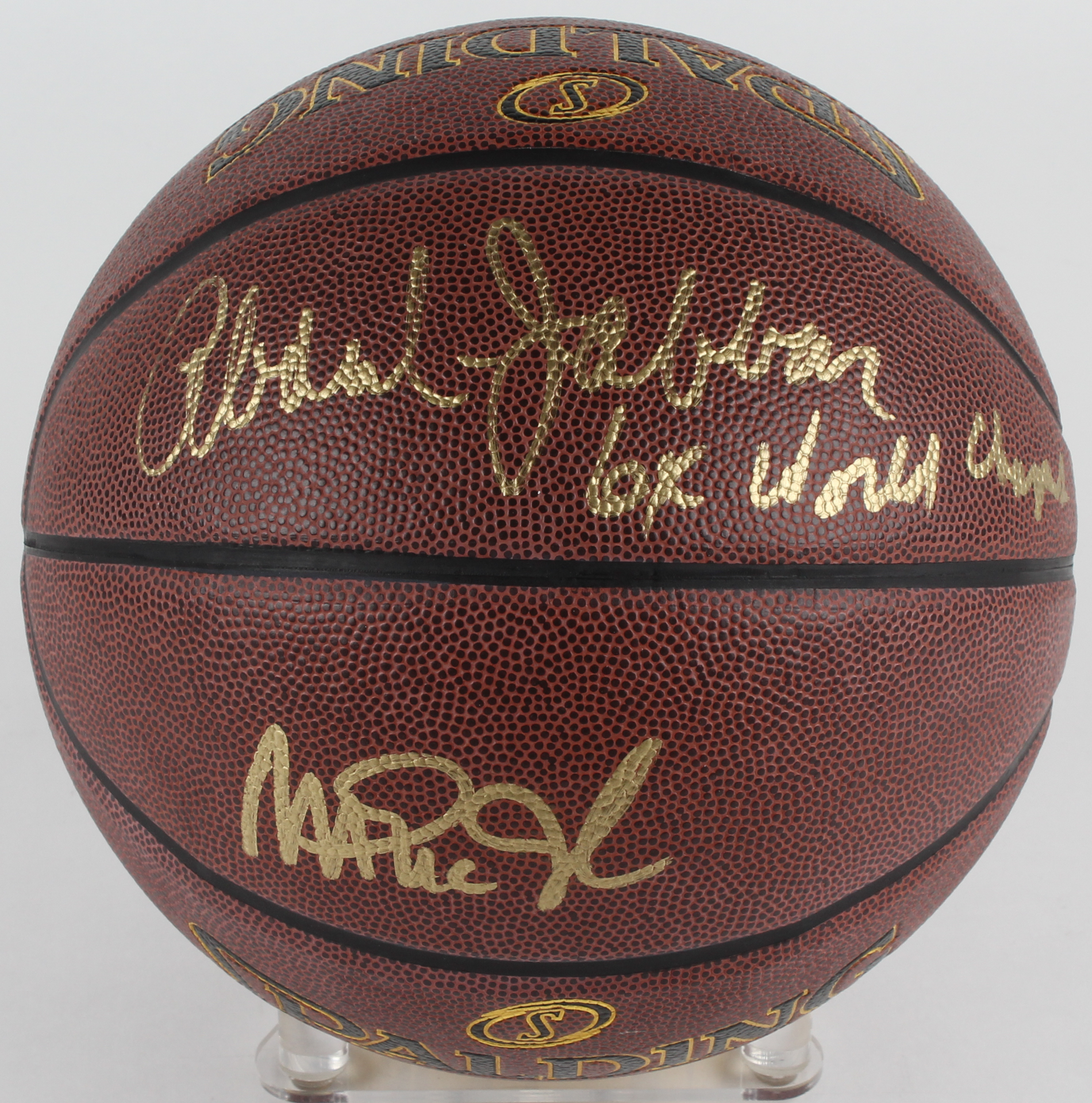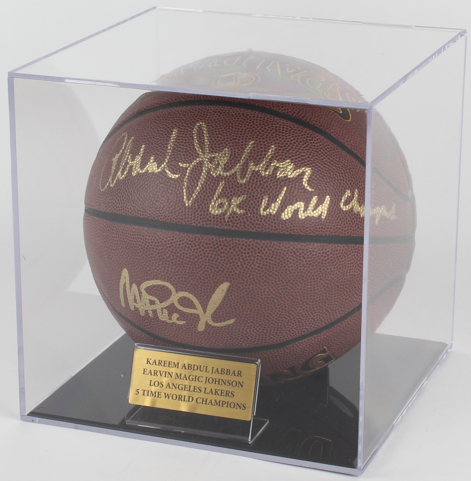Spalding NBA Elevation Indoor/Outdoor Basketball. Hand-signed in gold paint pen by Magic Johnson (Lakers, HOF) and Kareem Abdul-Jabbar (Lakers, HOF). Auction includes display case shown.