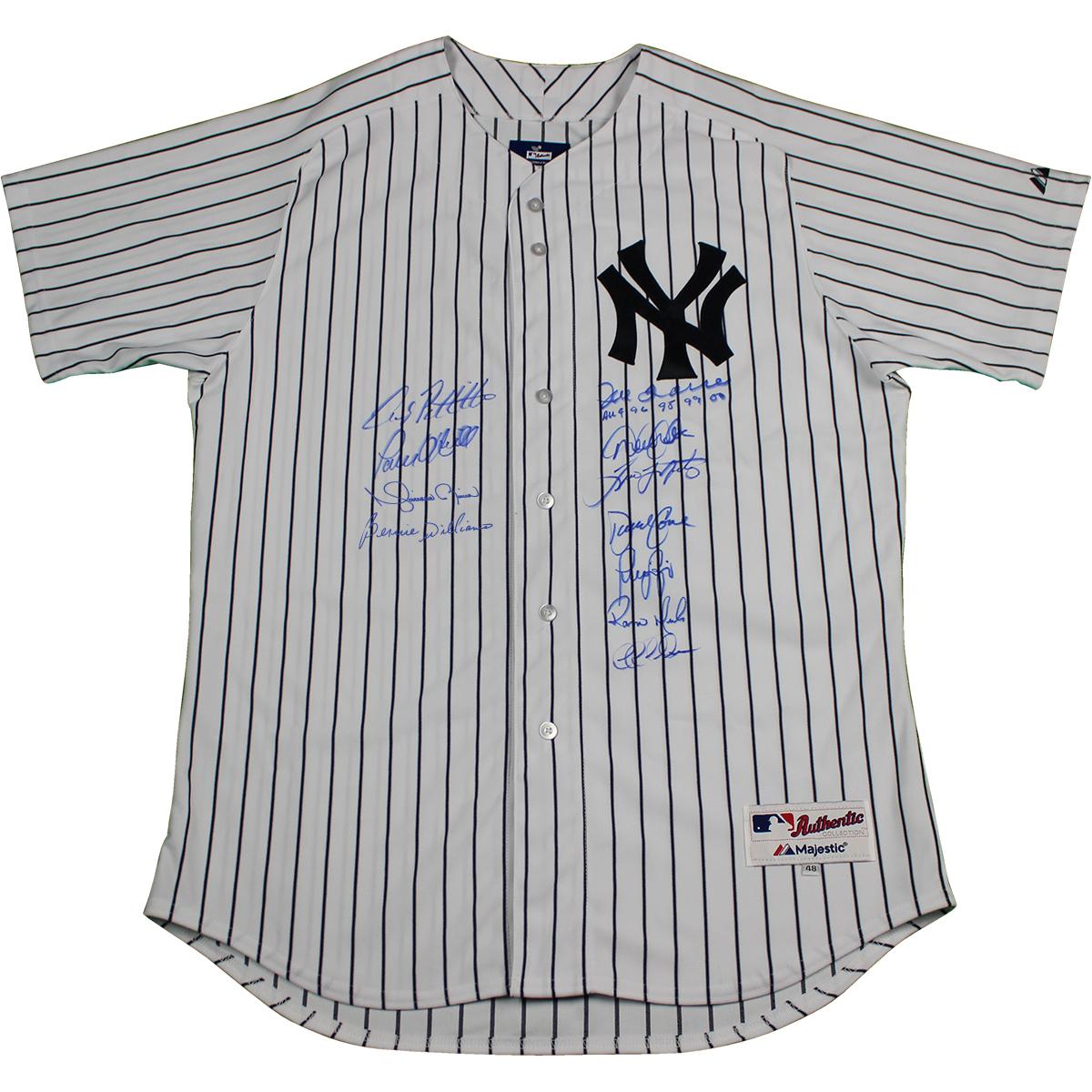 Majestic authentic on-field style jersey. Everything sewn on, size 48. Hand-signed and inscribed in blue felt-tip pen by (11) Yankees players including Andy Pettitte, Mariano Rivera, Bernie Williams, David Cone, Joe Torre, Paul O'Neill, Derek Jeter, Tino Martinez, Jeff Nelson and others. Limited Edition of 10. Please note, Torre inscribed the jersey "All 4 96,98,99,00". See photo for details.