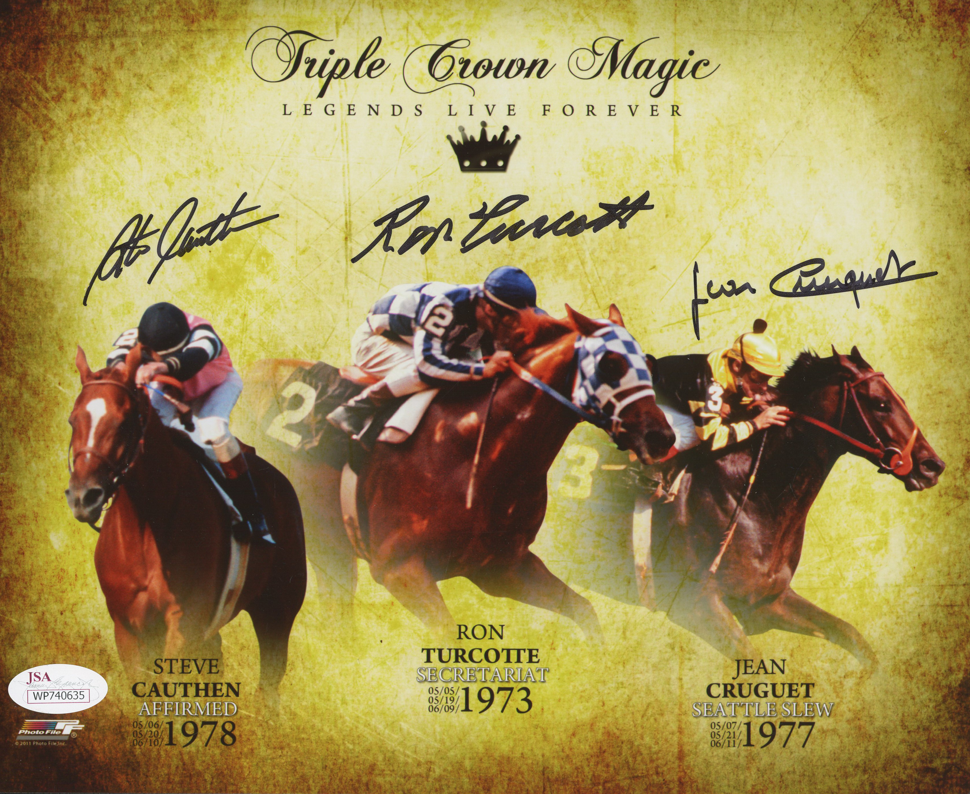 Steve Cauthen, Ron Turcotte & Jean Cruguet Signed 8x10 Photo (JSA COA)
