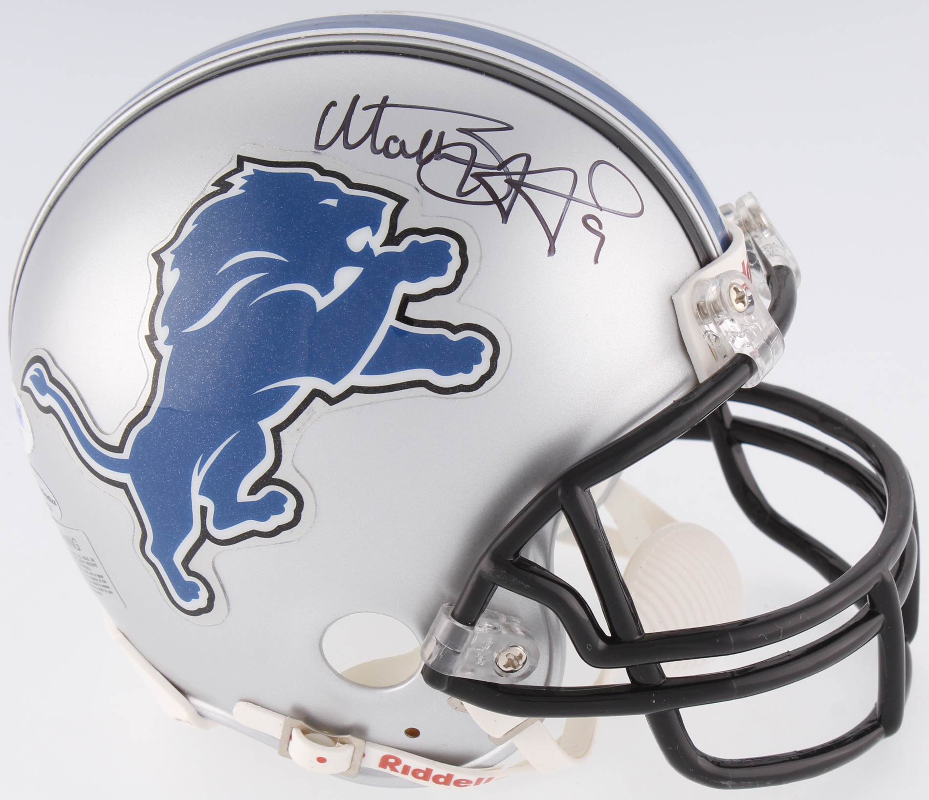 Riddell Lions mini helmet. Hand signed in black felt-tip pen by Matthew Stafford.