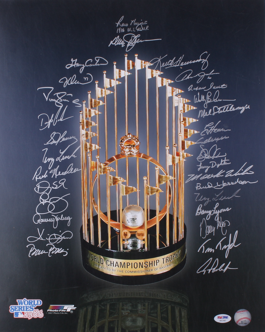 1986 Mets World Series Championship Trophy 16x20 Photo Team-Signed by (29) with Darryl Strawberry, Gary Carter, Davey Johnson (PSA LOA & MLB Hologram)