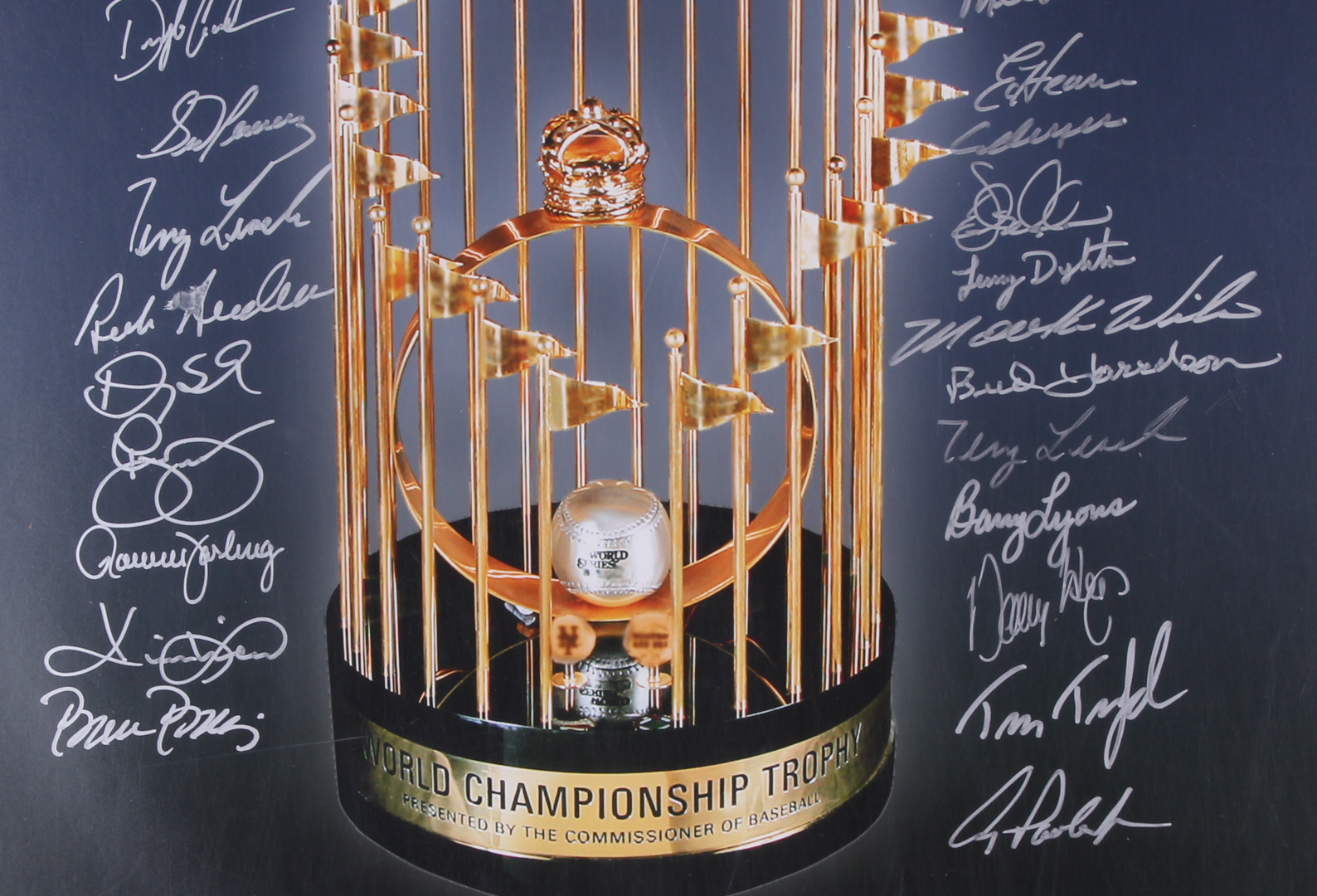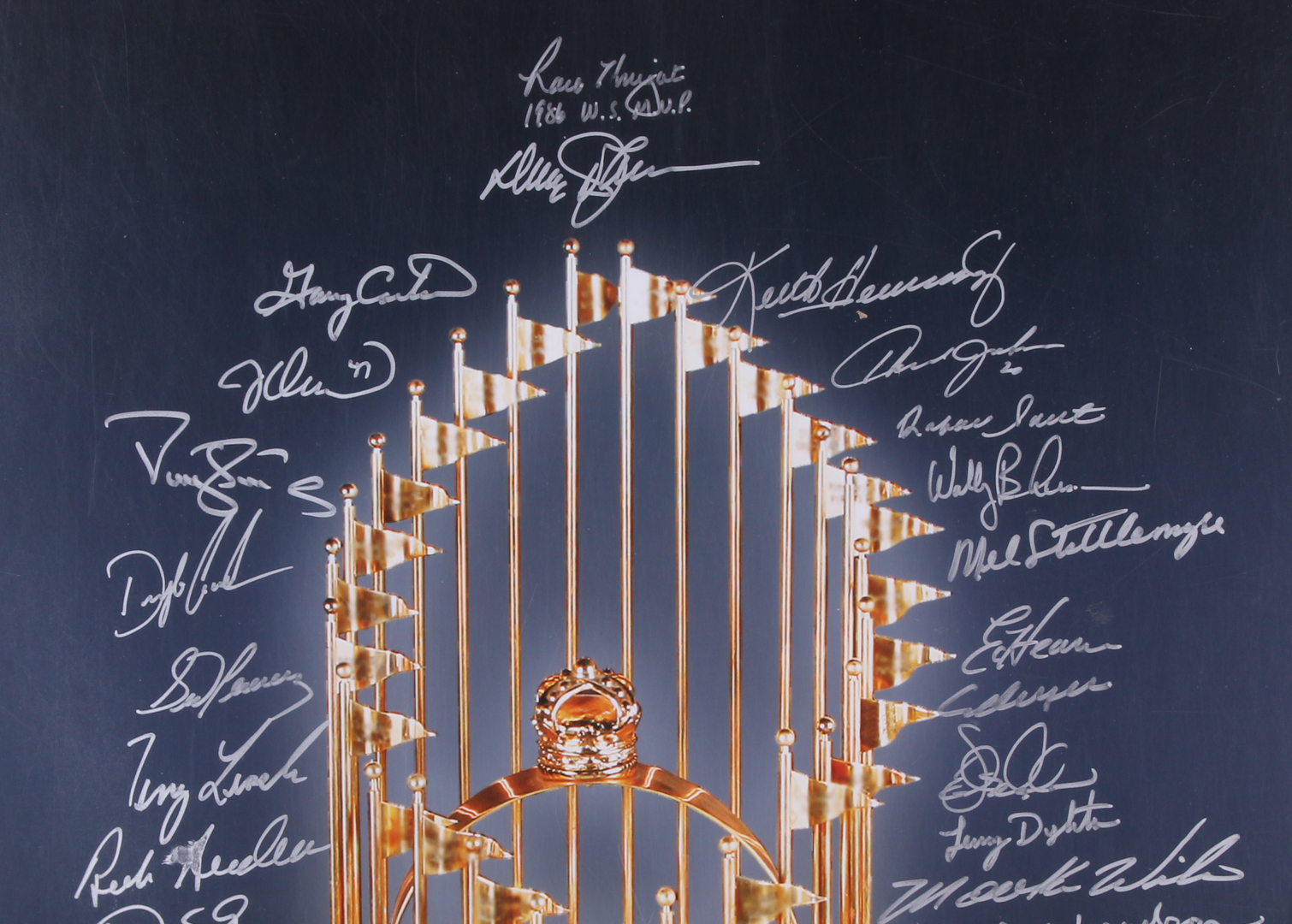 Photo measures 16" x 20" and has been hand-signed in silver paint pen by (29) members of the 1986 New York Mets including Darryl Strawberry, Gary Carter, Davey Johnson, Rick Anderson, Wally Backman, Bruce Berenyi, Ron Darling, Lenny Dykstra, Sid Fernandez, Doc Gooden, Bud Harrelson, Ed Hearn, Danny Heep, Keith Hernandez, Howard Johnson, Ray Knight, Terry Leach, Ed Lynch, Barry Lyons, Dave Magadan, Roger McDowell, Kevin Mitchell, Jesse Orosco, Greg Pavlick, Rafael Santana, Doug Sisk, Mel Stottlemyre, Tim Teufel, and Mookie Wilson.