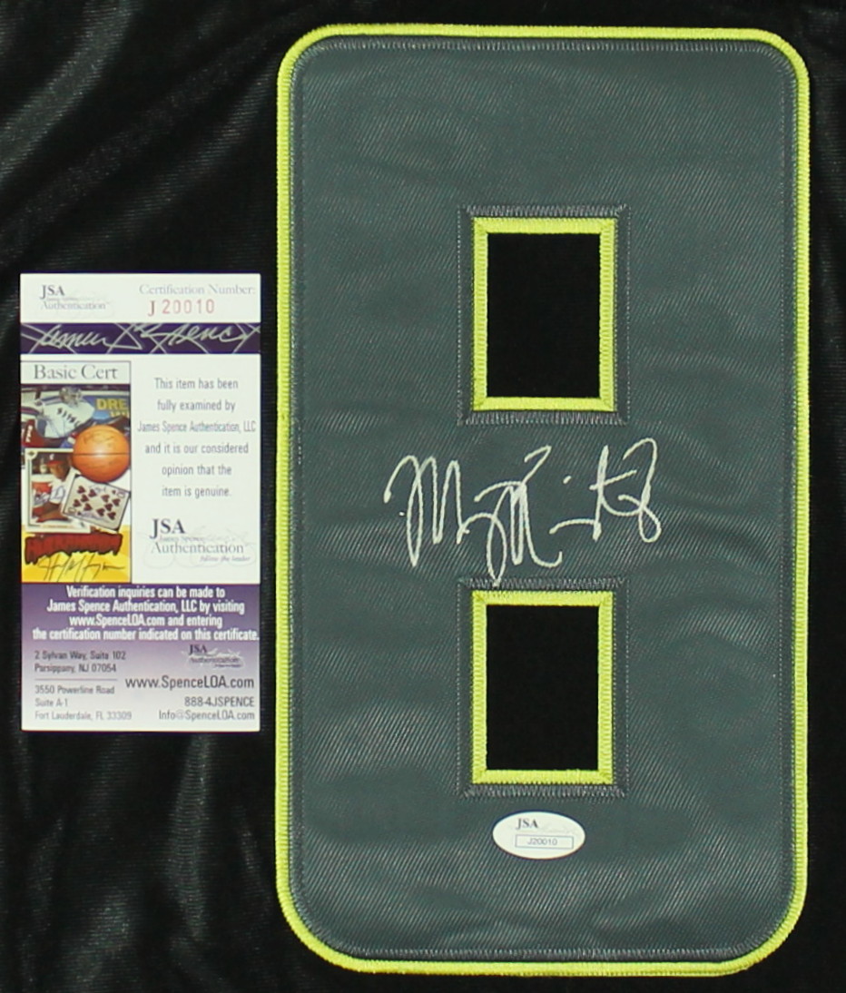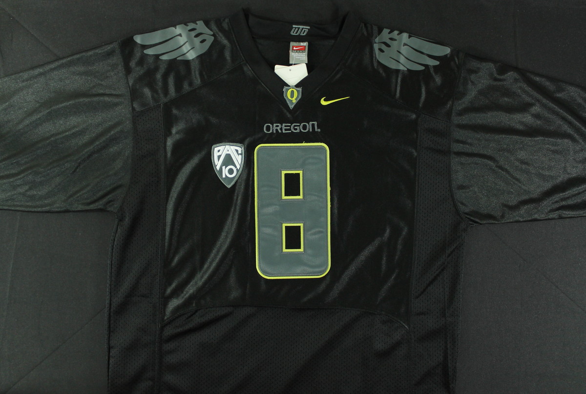 Nike on-field style jersey. Everything sewn on, size 52. Hand-signed in silver paint pen by Marcus Mariota (Oregon Ducks). The autograph includes an official James Spence Authentication (JSA) hologram and matching COA for authenticity purposes.