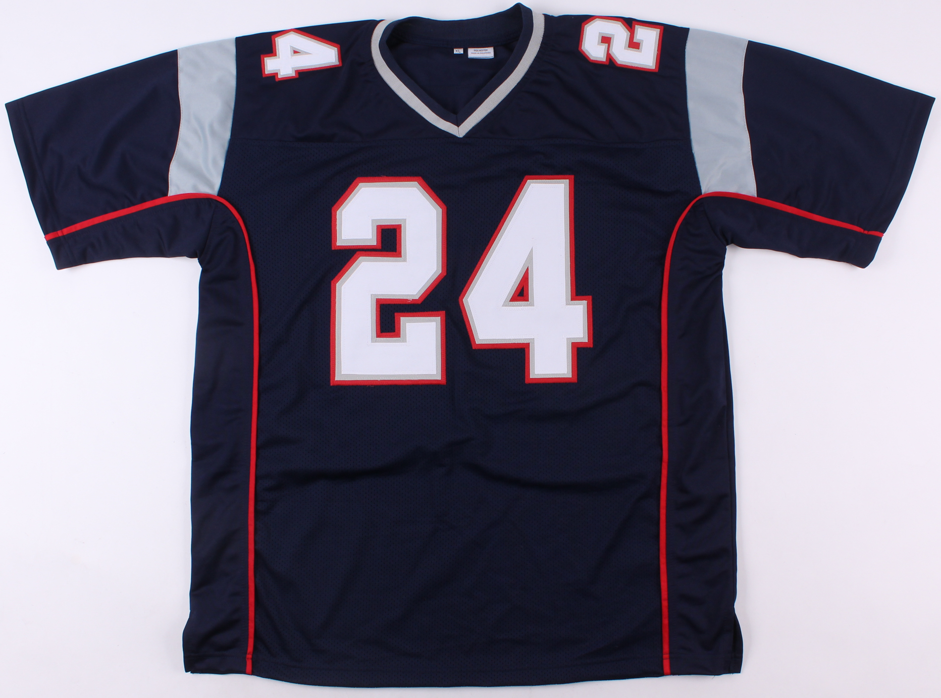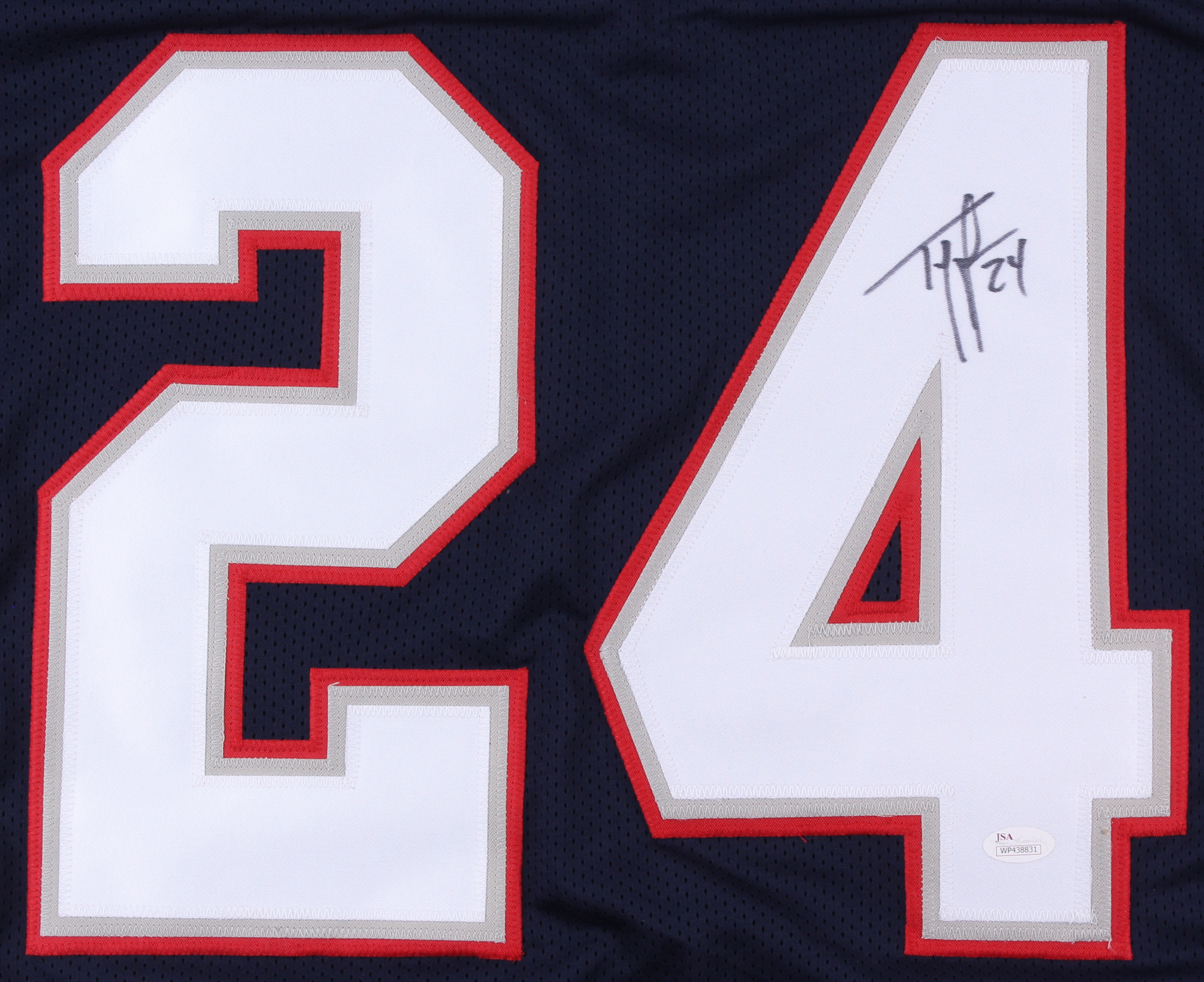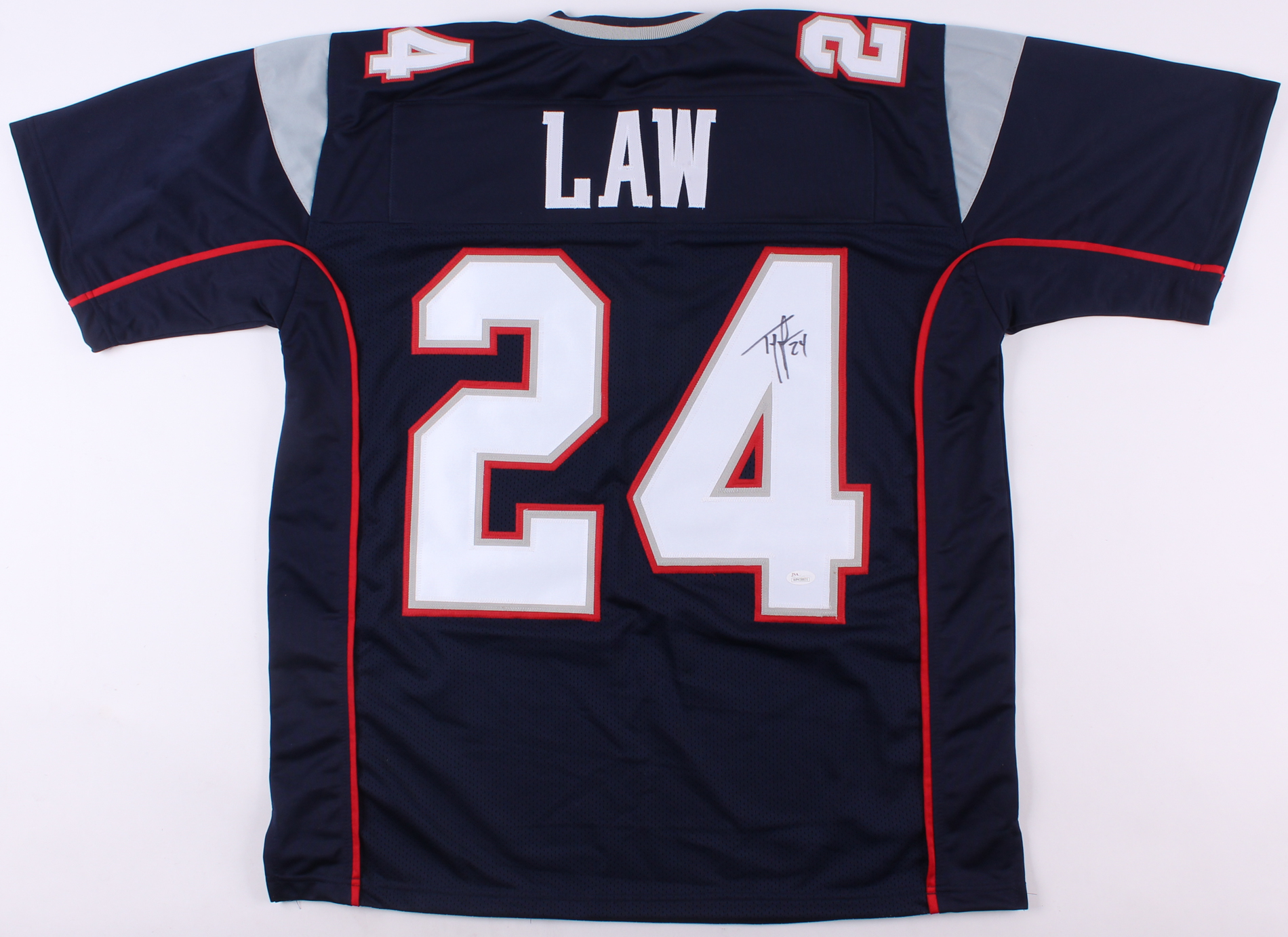 Custom on-field style jersey. Everything sewn on, size XL. Hand signed by Ty Law (HOF).