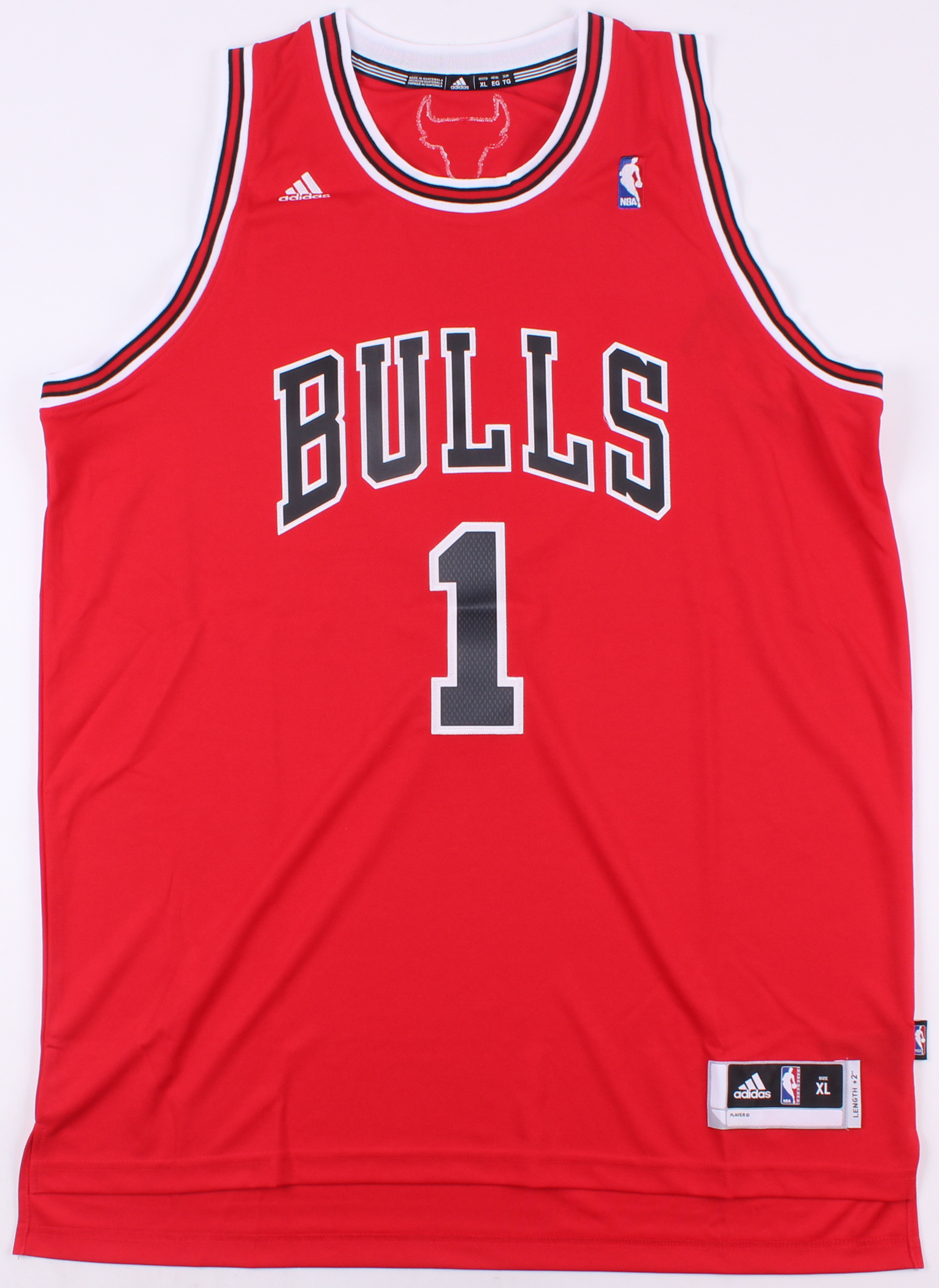 Adidas on-court style jersey. Everything sewn on, size XL. Hand signed in silver paint pen by Derrick Rose.