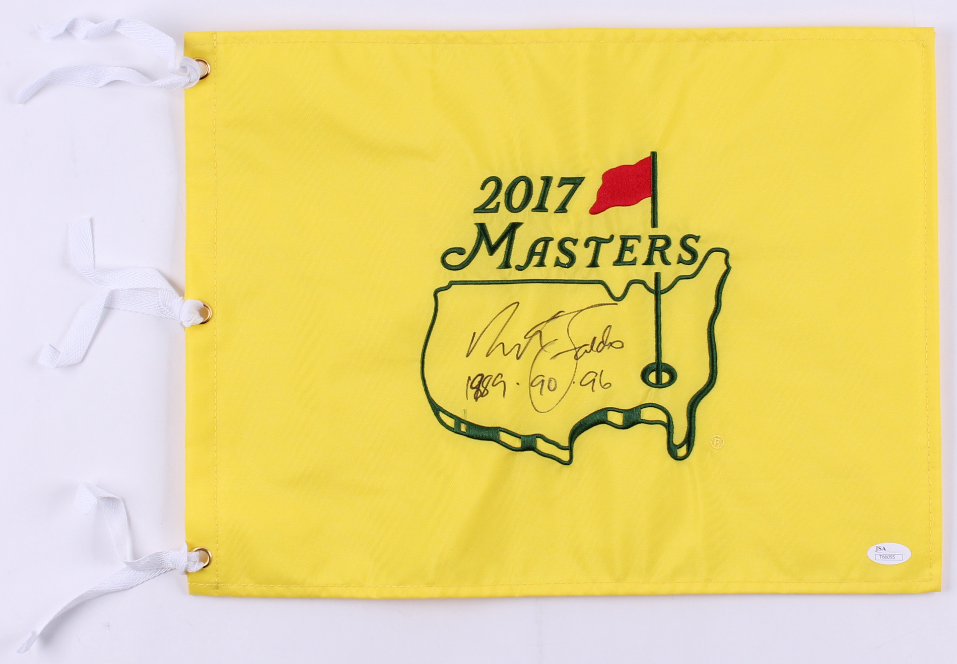 Sir Nick Faldo Signed 2017 Masters Tournament Golf Pin Flag Inscribed "1989 - 90 - 96" (JSA COA)
