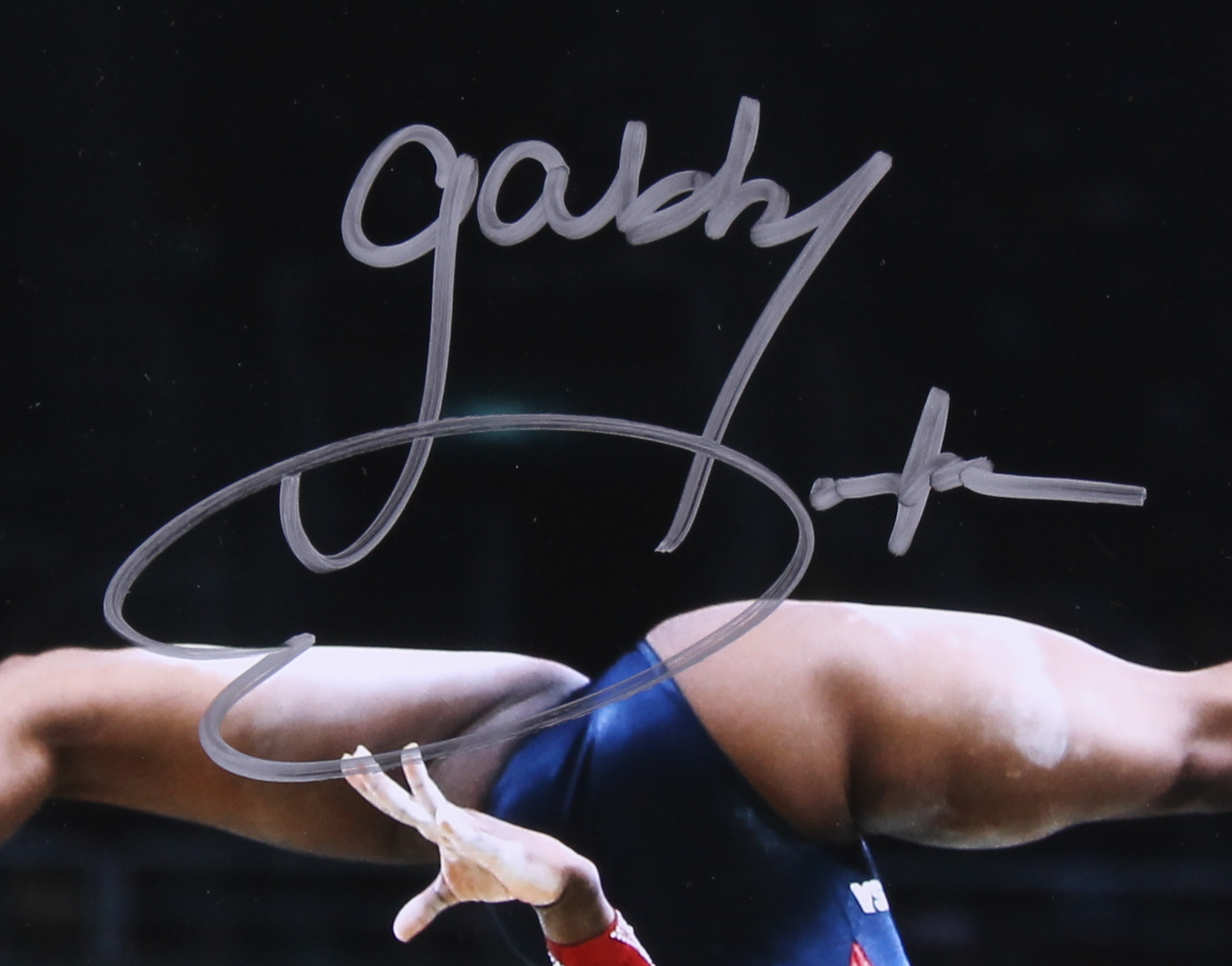 Photo measures 16" x 20" in size and has been hand-signed in silver paint pen by Gabby Douglas.