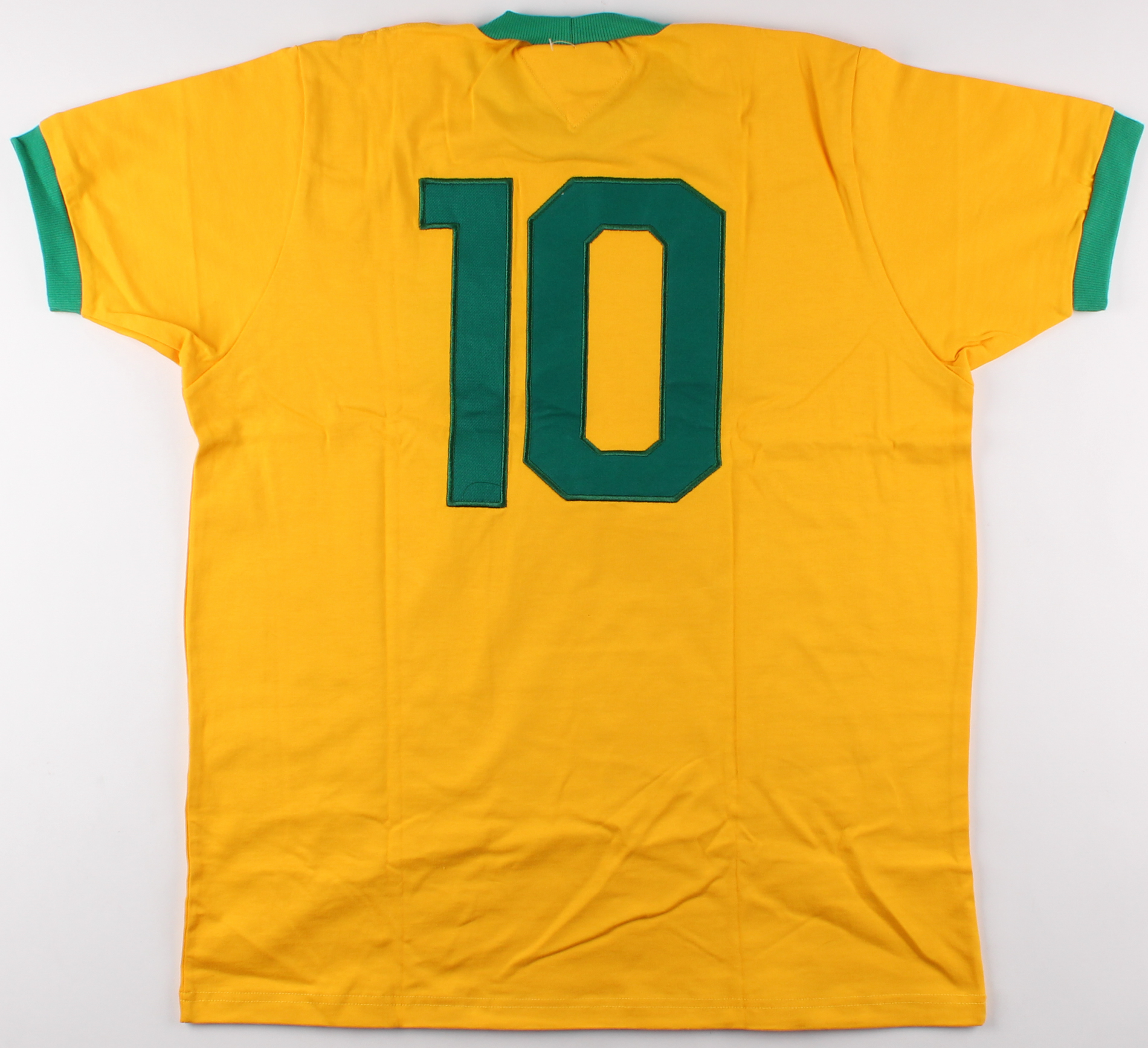 Team Brazil jersey T-shirt. Everything is sewn on, size XL. Hand-signed in black felt-tip pen by Pele.