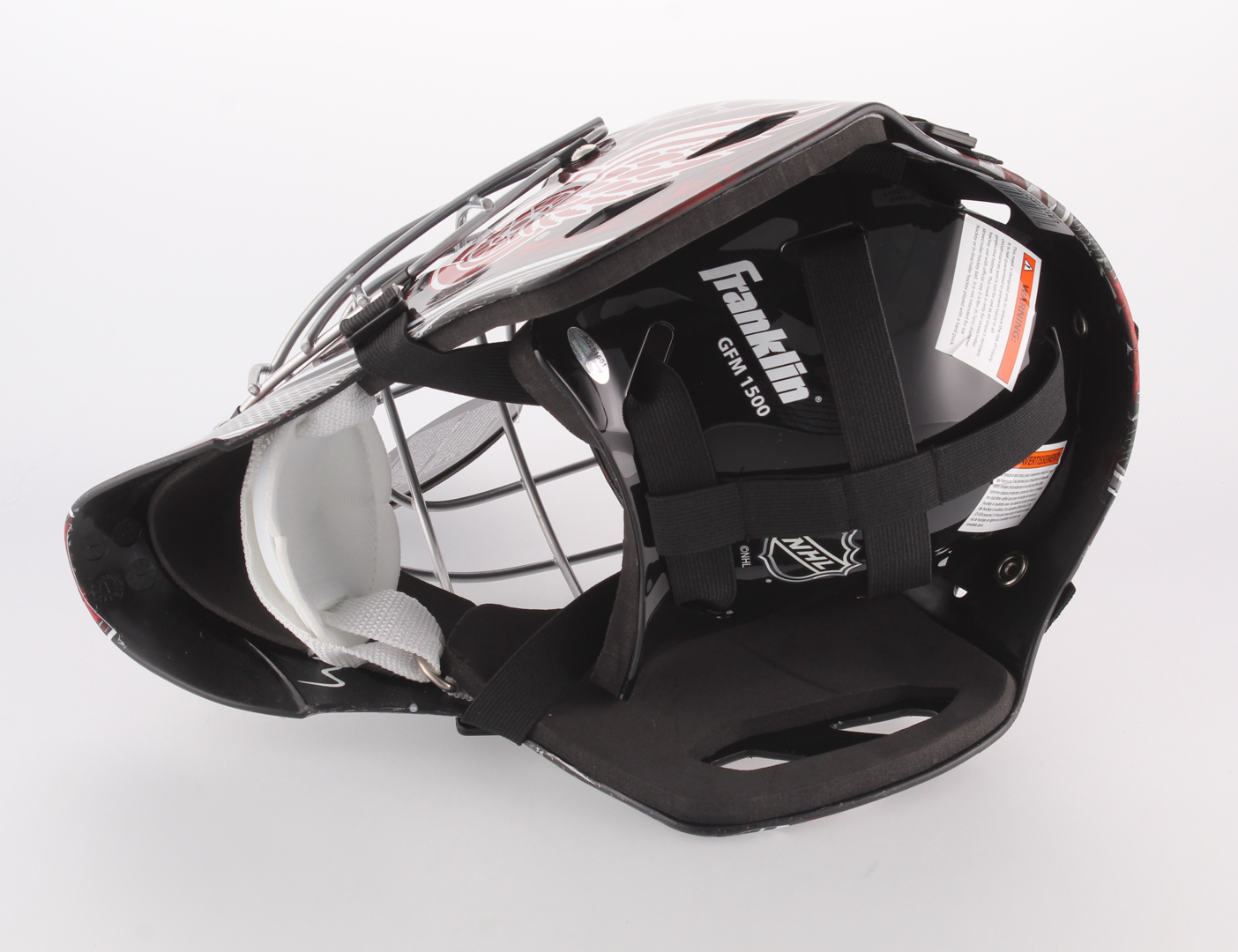 Franklin full-size replica goalie mask. Hand-signed and inscribed in blue felt-tip pen by Dominik Hasek. (HOF)
