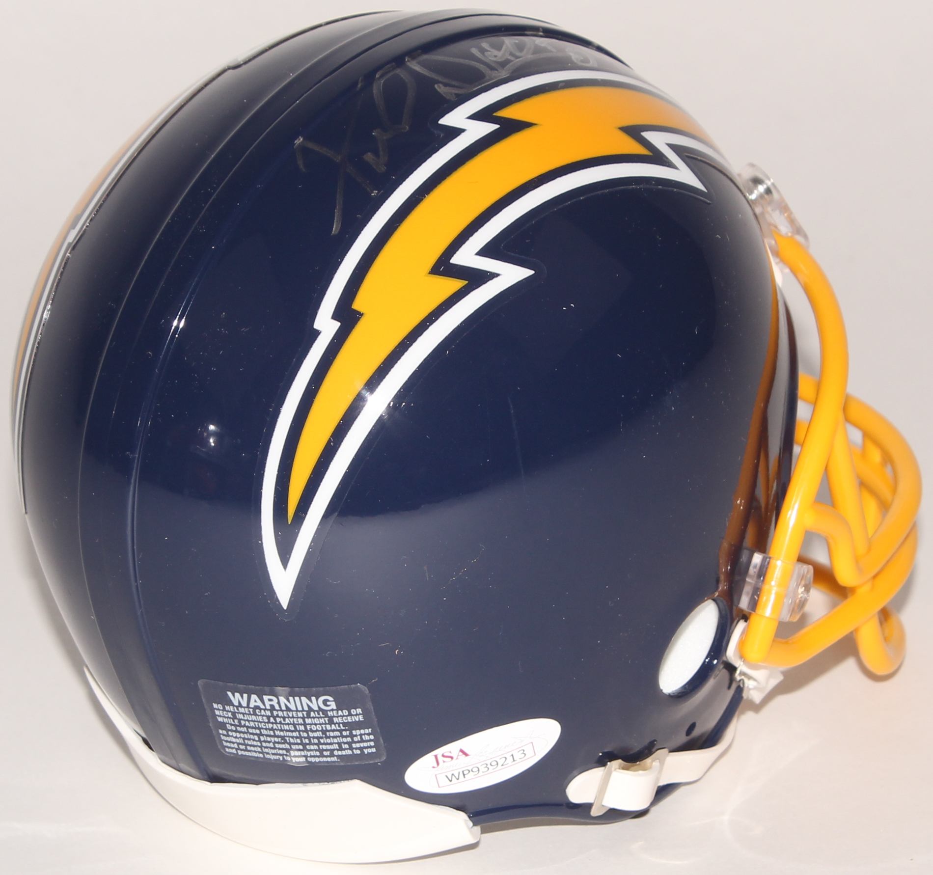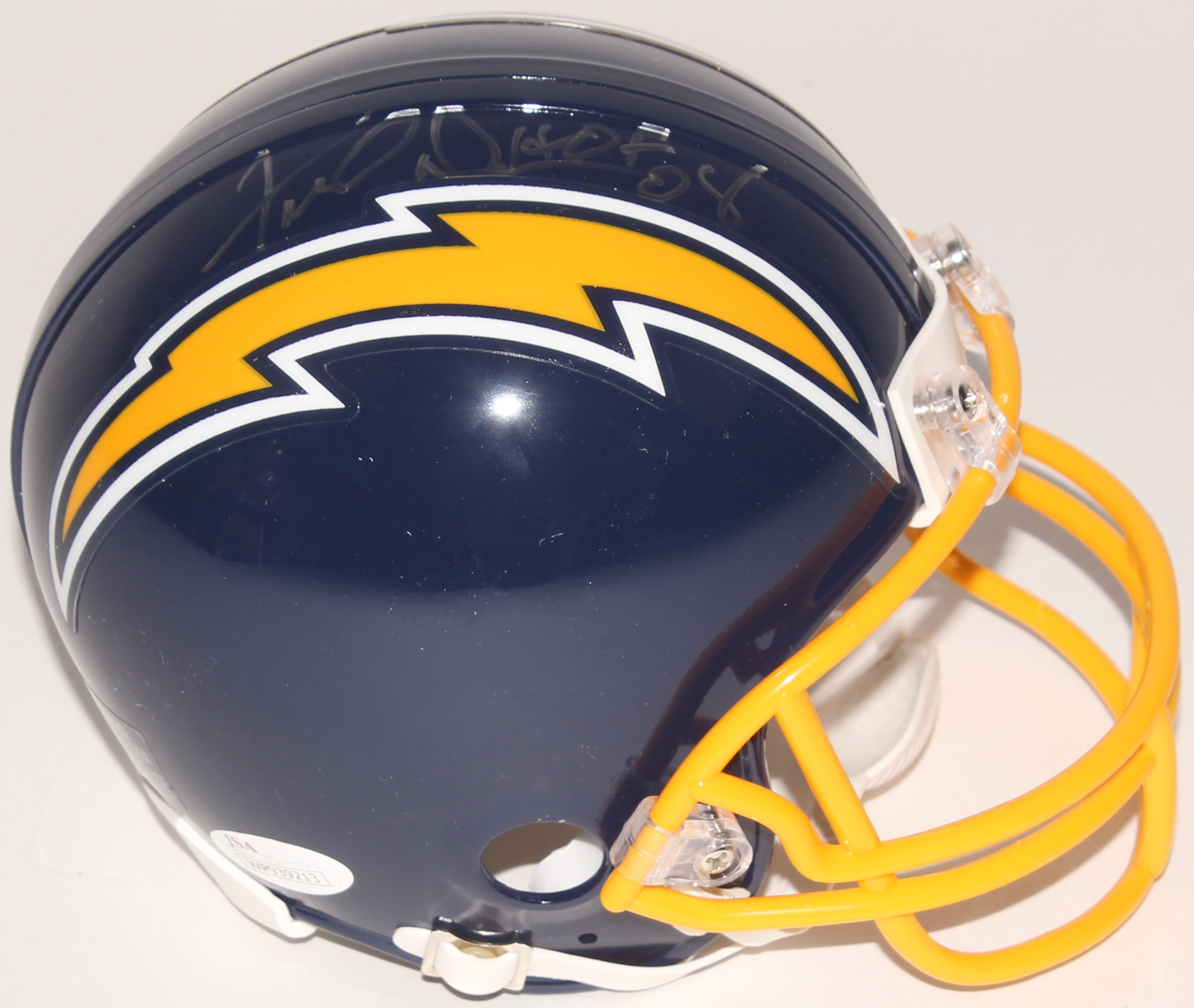 San Diego Chargers throwback mini helmet has been hand-signed and inscribed in silver paint pen by Fred Dean. (HOF)