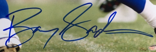 Photo measures 8" x 10" and has been hand-signed in blue felt-tip pen by Barry Sanders (HOF).