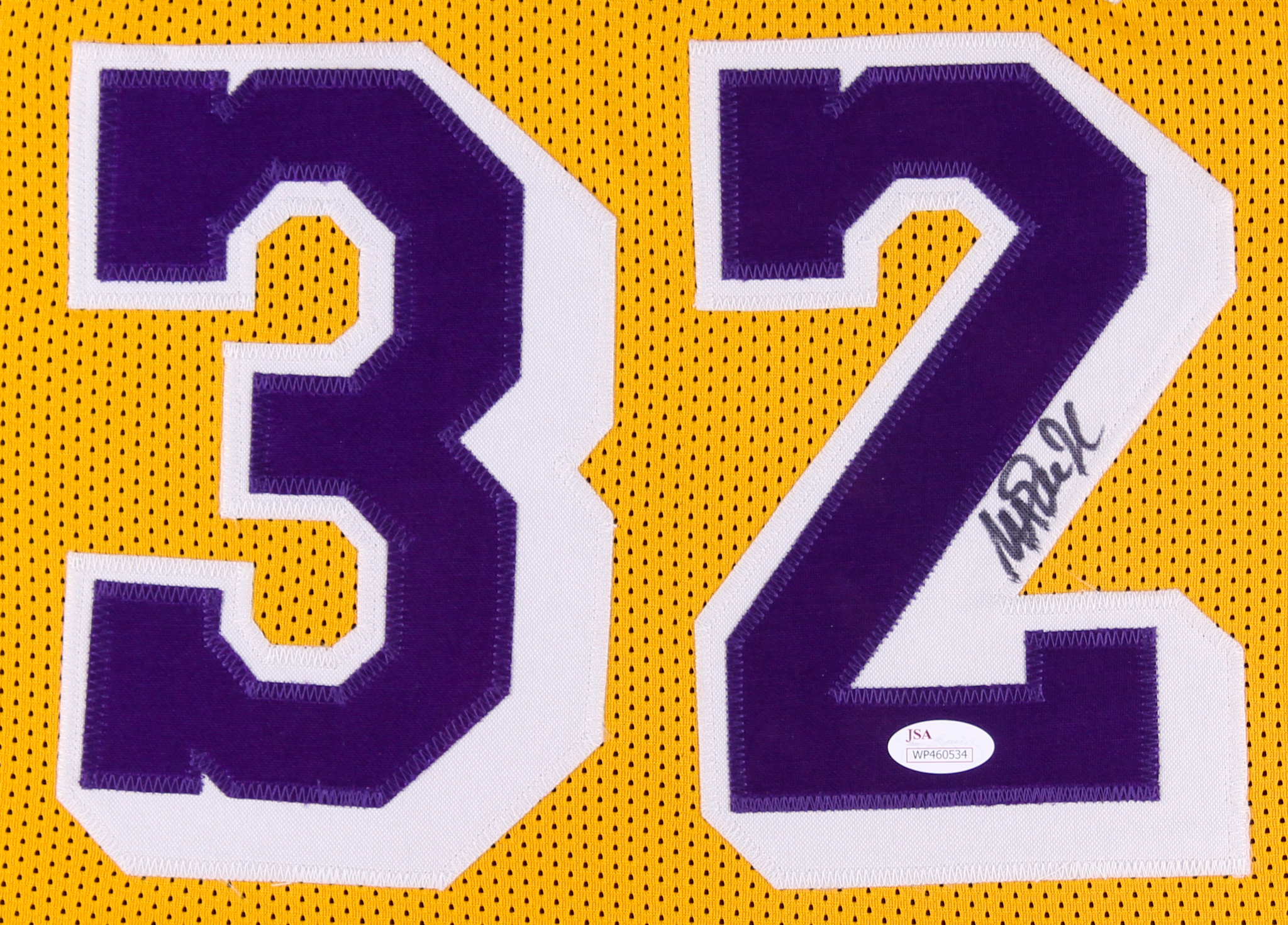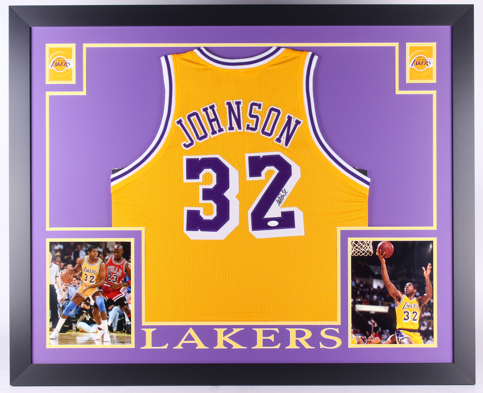 Custom framed jersey measures 35.5" x 43.5" in size. Hand-signed in black felt-tip pen by Magic Johnson (HOF).