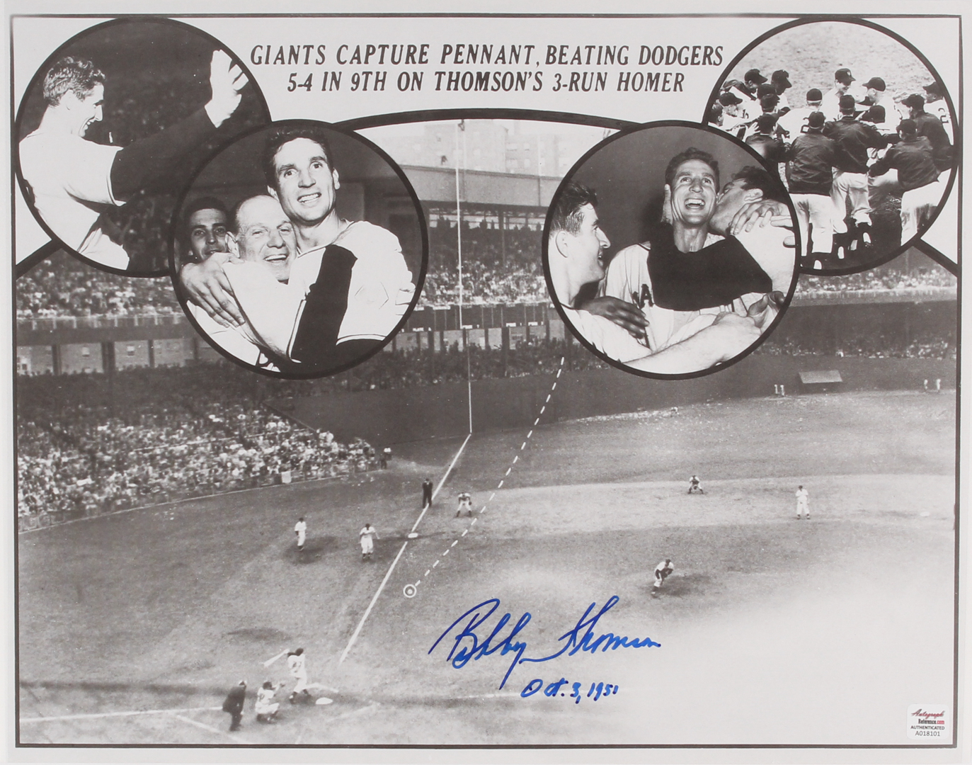 Photo measures 11" x 14" in size and has been hand-signed in blue felt-tip pen by Bobby Thomson. (D. 2010)