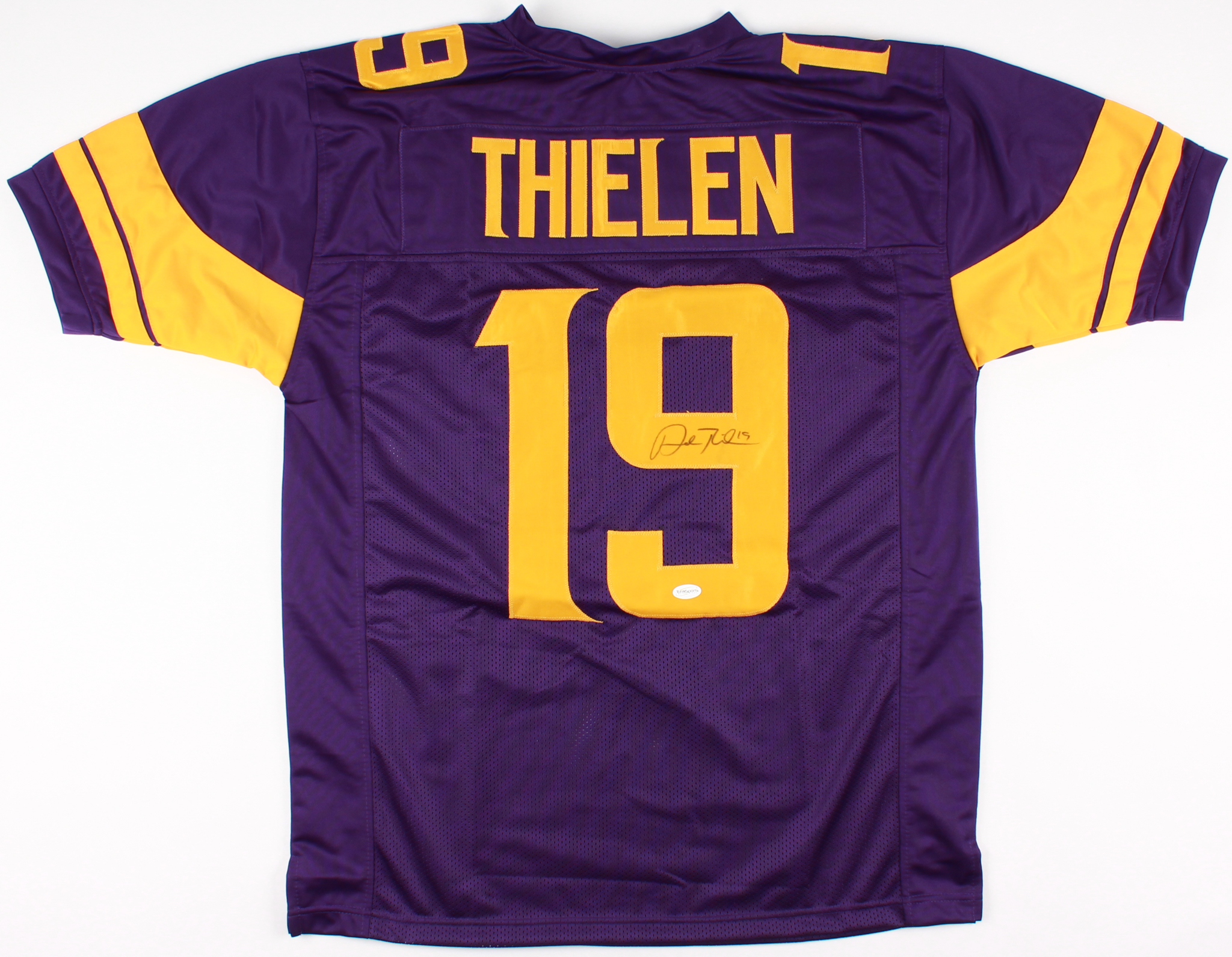 Custom on-field style jersey. Everything is sewn on, size XL. Hand-signed in black felt-tip pen by Adam Thielen.