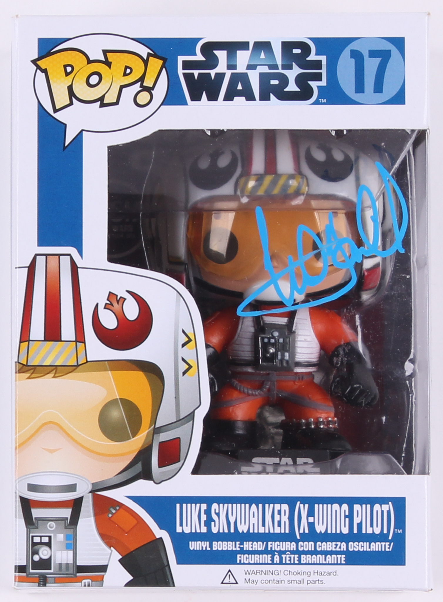 Funko Pop vinyl figure measures approximately 4" in height. Packaging has been hand-signed in blue paint pen by Mark Hamill (Luke Skywalker).