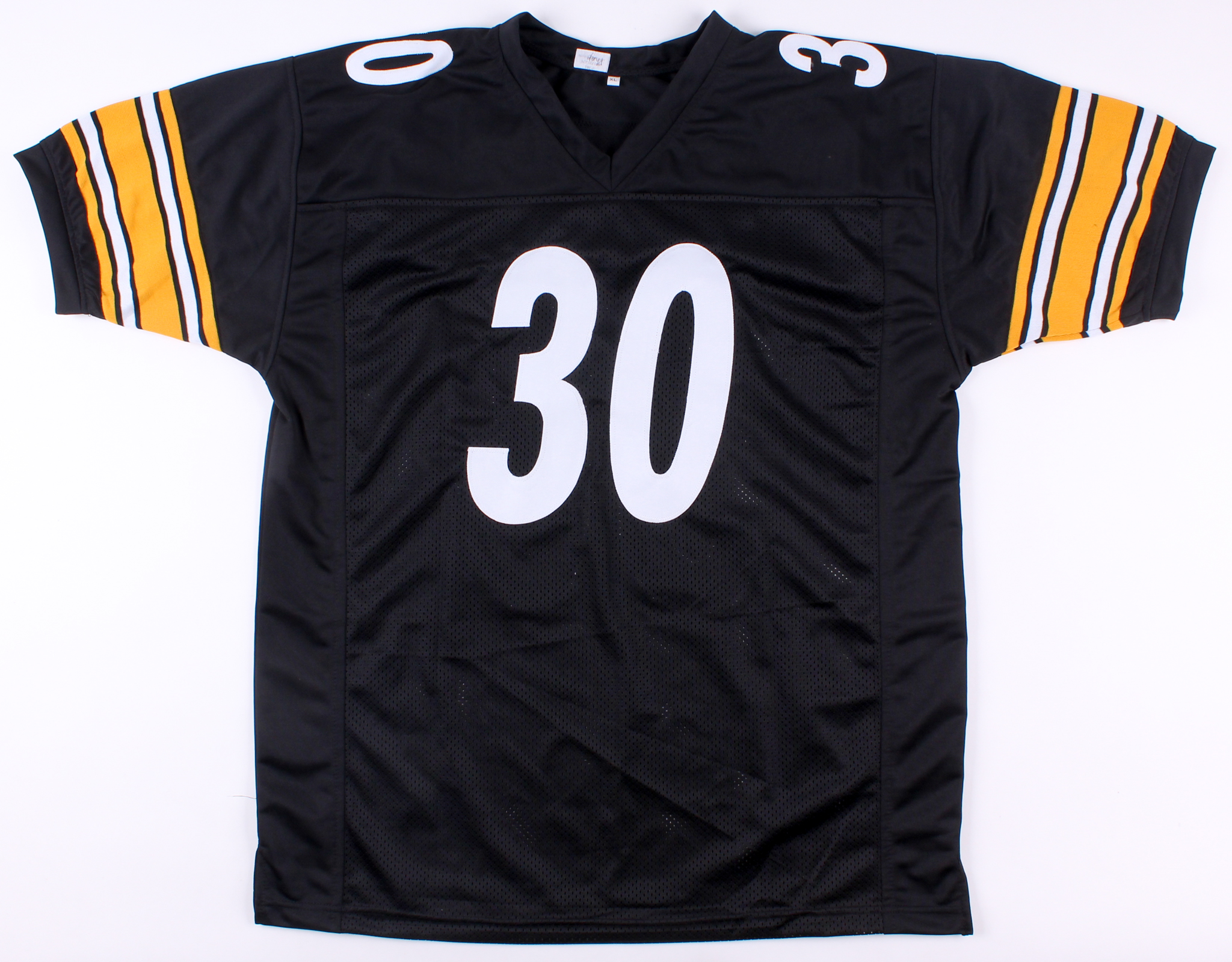 Custom on-field style jersey. Everything is sewn on, size XL. Hand-signed in black felt-tip pen by James Conner.