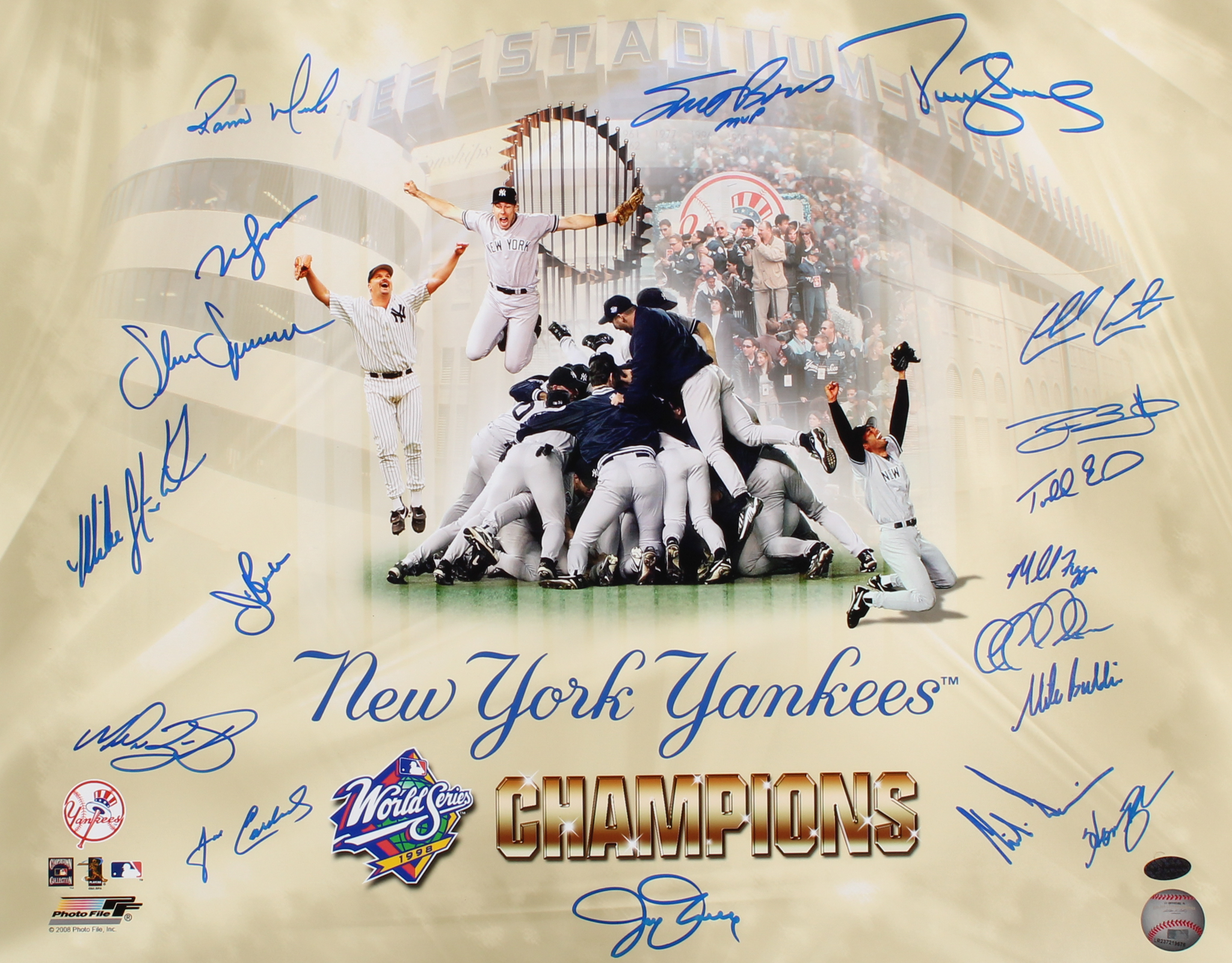 Photo measures 16" x 20" and has been hand-signed in blue felt-tip pen by (18) members of the 1998 New York Yankees including, Scott Brosius, Darryl Strawberry, Chad Curtis, Mike Stanton, Todd Erdos, Shane Spencer, Mike Jerzembeck, Willie Banks, Jim Bruske, Jose Cardenal, Ryan Bradley, Ramiro Mendoza, Jay Tessmer, Mike Vigga, Homer Bush, Jeff Nelson, Mike Buddie and Chili Davis.