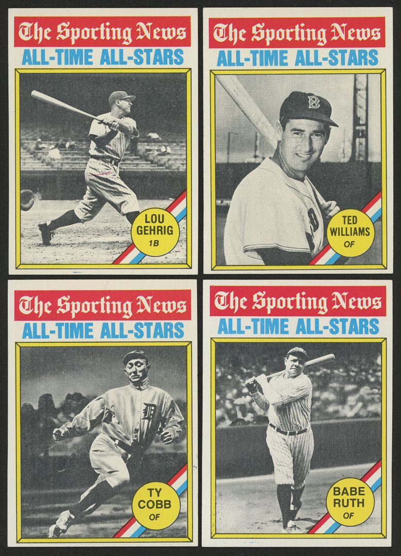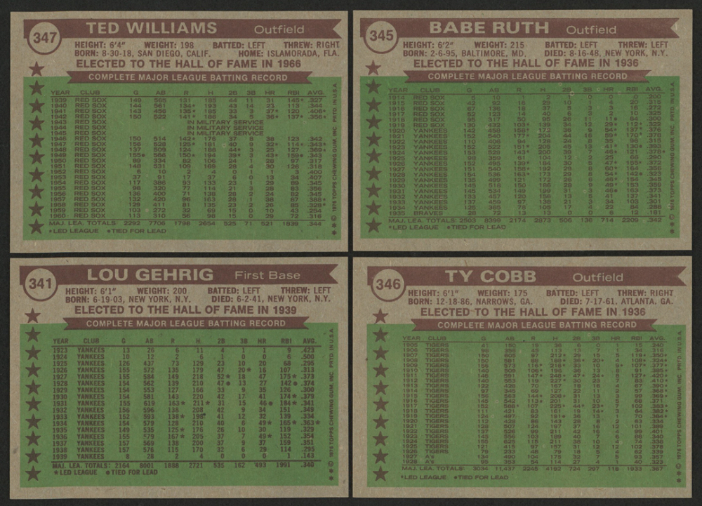 Lot of (4) 1976 Topps Baseball Cards with #346 Ty Cobb ATG, 1976 Topps #345 Babe Ruth ATG, 1976 Topps #341 Lou Gehrig ATG, 1976 Topps #347 Ted Williams ATG